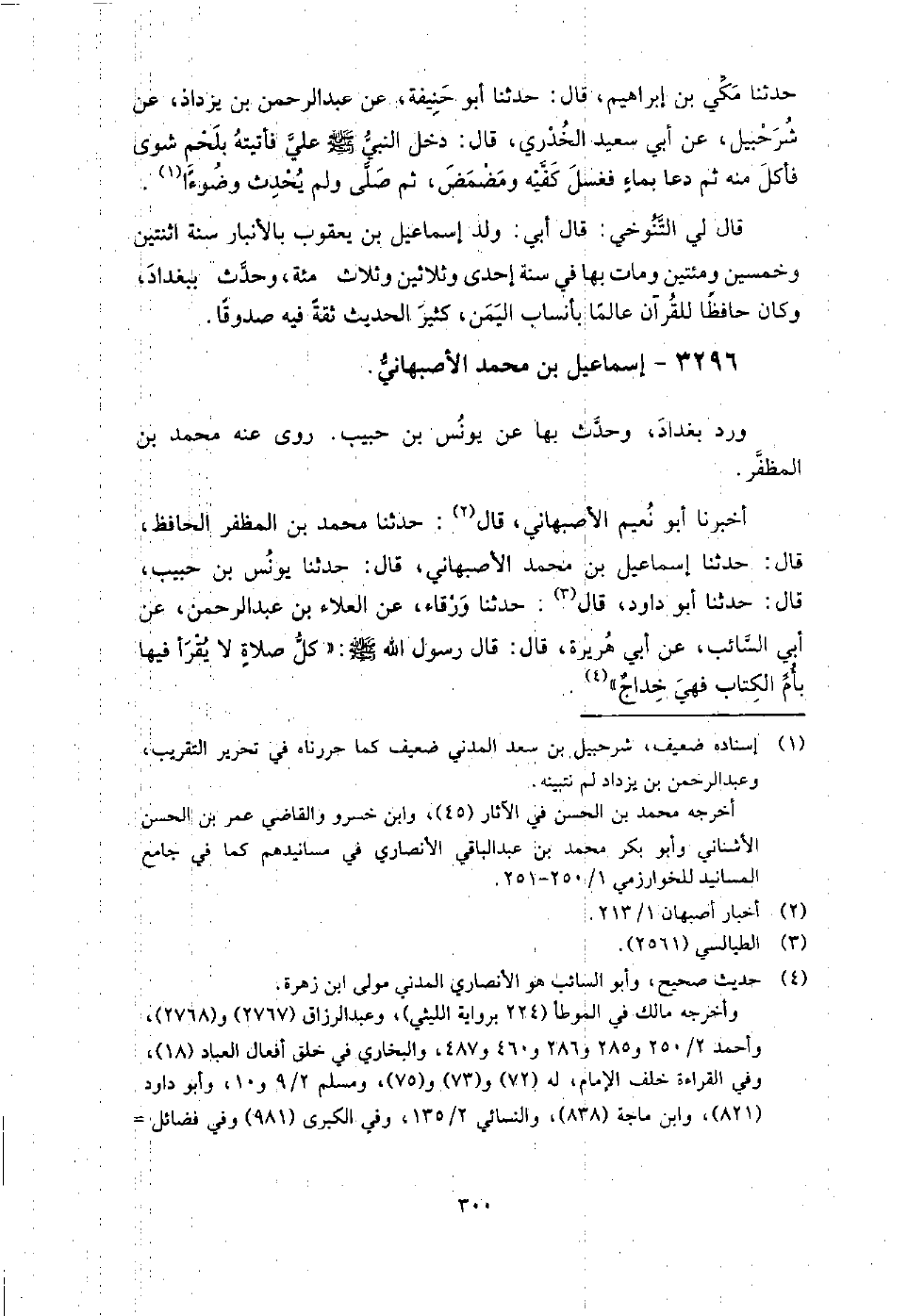 3296 - إسماعيل بن محمد الأصبهاني ورد بغداد، وحدث بها عن يونس بن حبيب، روى عنه محمد بن المظفر.