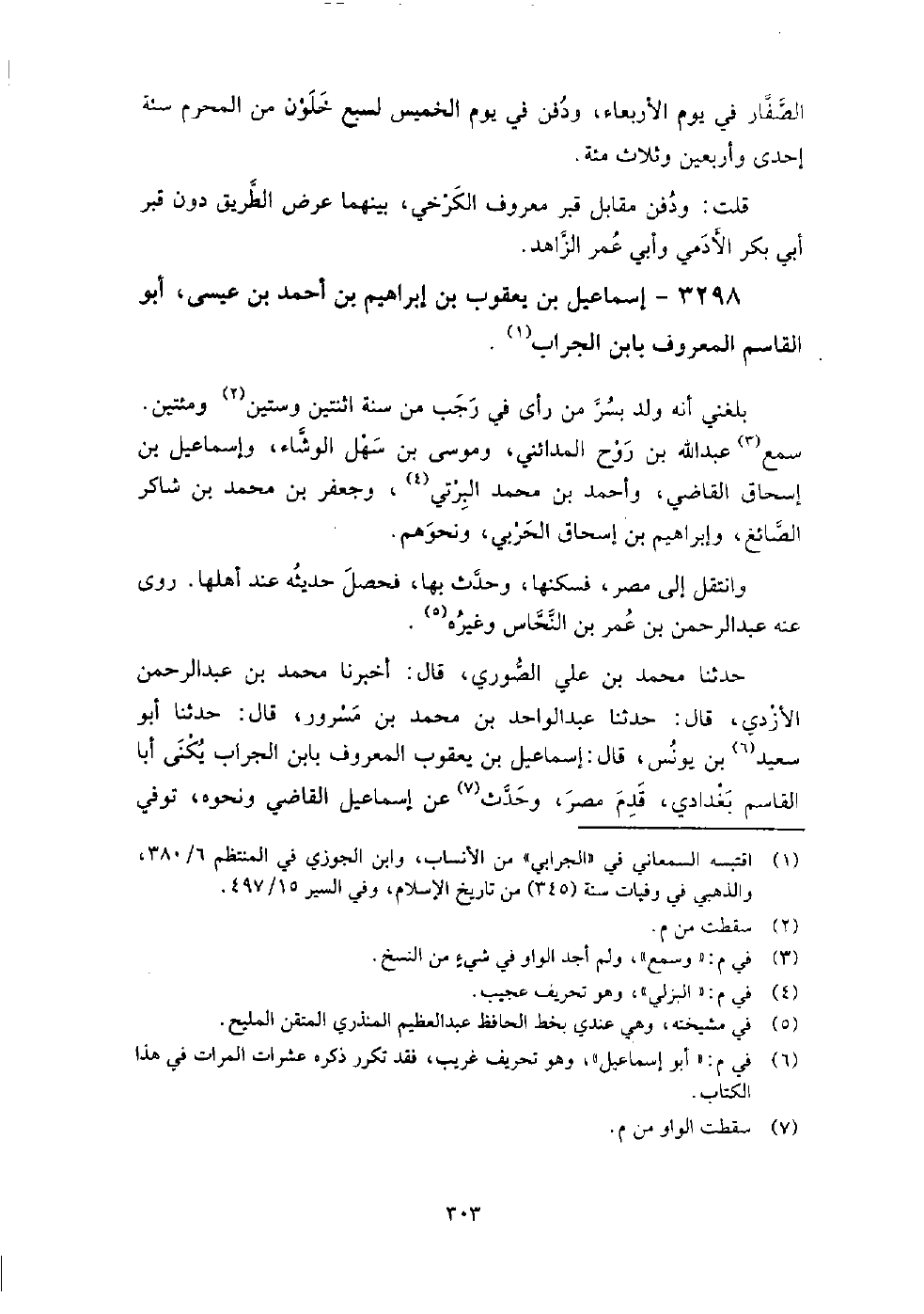 3298 - إسماعيل بن يعقوب بن إبراهيم بن أحمد بن عيسى أبو القاسم المعروف بابن الجراب بلغني أنه ولد بسر من رأى في رجب من سنة اثنتين وستين ومائتين، سمع: عبد الله بن روح المدائني، وموسى بن سهل الوشاء، وإسماعيل بن إسحاق القاضي، وأحمد بن محمد البرتي وجعفر بن محمد بن شاكر الصائغ، وإبراهيم بن إسحاق الحربي، ونحوهم.