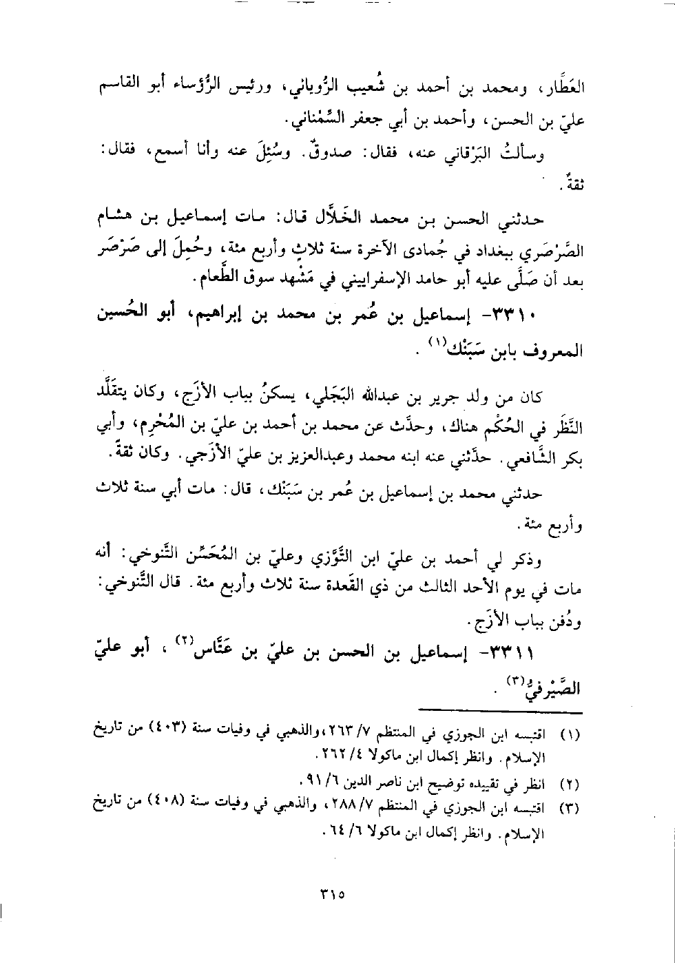 3310 - إسماعيل بن عمر بن محمد بن إبراهيم أبو الحسين المعروف بابن سبنك كان من ولد جرير بن عبد الله البجلي، يسكن بباب الأزج، وكان يتقلد النظر في الحكم هناك، وحدث عن: محمد بن أحمد بن علي بن المحرم، وأبي بكر الشافعي، حدثني عنه ابنه محمد، وعبد العزيز بن علي الأزجي، وكان ثقة.