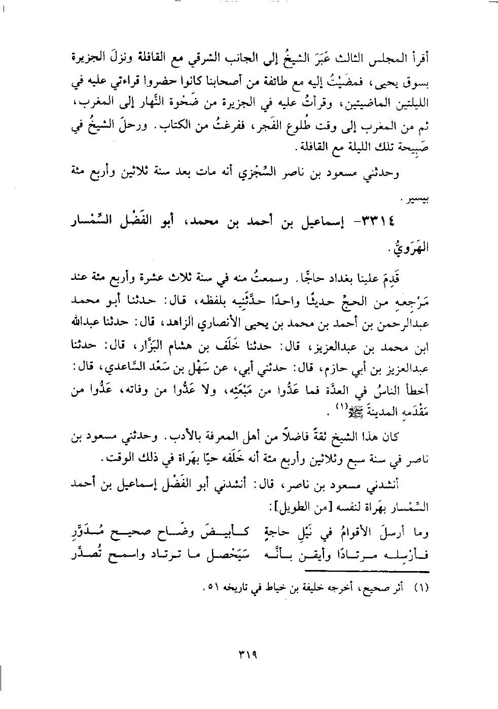 3314 - إسماعيل بن أحمد بن محمد أبو الفضل السمسار الهروي قدم علينا بغداد حاجا، وسمعت منه في سنة ثلاث عشرة وأربع مائة عند مرجعه من الحج حديثا واحدا حدثنيه بلفظه.