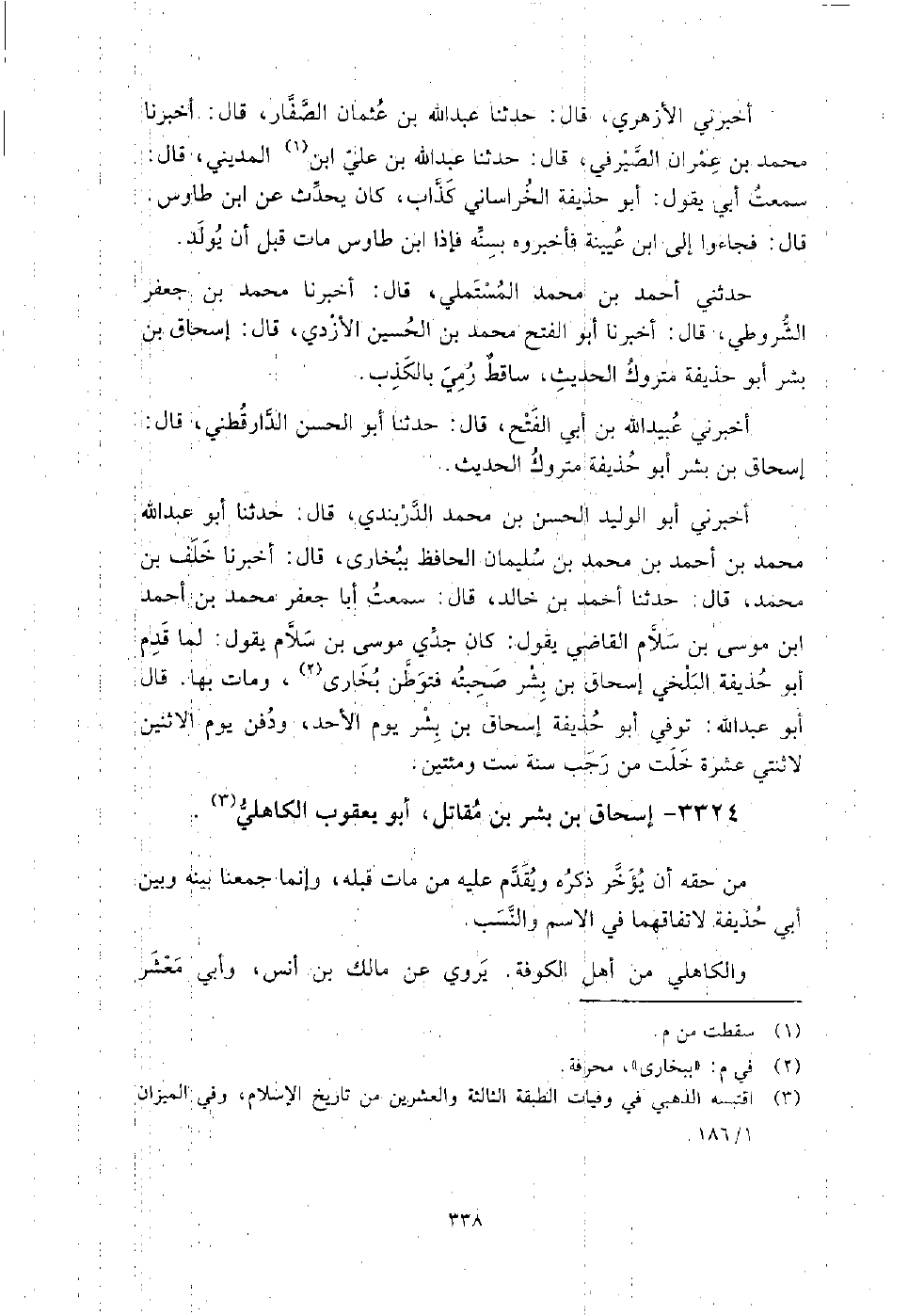 3324 - إسحاق بن بشر بن مقاتل أبو يعقوب الكاهلي من حقه أن يؤخر ذكره ويقدم على من مات قبله، وإنما جمعنا بينه وبين أبي حذيفة لاتفاقهما في الاسم والنسب.