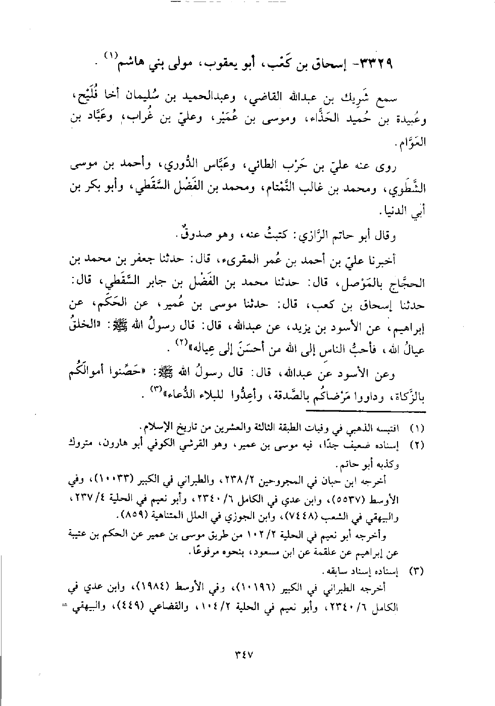 3329 - إسحاق بن كعب أبو يعقوب مولى بني هاشم سمع شريك بن عبد الله القاضي، وعبد الحميد بن سليمان أخا فليح، وعبيدة بن حميد الحذاء، وموسى بن عمير، وعلي بن غراب، وعباد بن العوام.