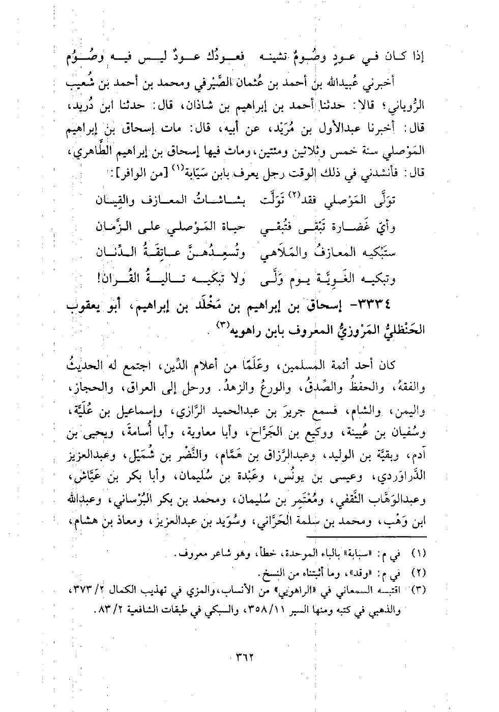 3334 - إسحاق بن إبراهيم بن مخلد بن إبراهيم أبو يعقوب الحنظلي المروزي المعروف بابن راهويه كان أحد أئمة المسلمين، وعلما من أعلام الدين، اجتمع له الحديث والفقه والحفظ والصدق والورع والزهد، ورحل إلى العراق والحجاز واليمن والشام، فسمع: جرير بن عبد الحميد الرازي، وإسماعيل ابن علية، وسفيان بن عيينة، ووكيع بن الجراح، وأبا معاوية، وأبا أسامة، ويحيى بن آدم، وبقية بن الوليد، وعبد الرزاق بن همام، والنضر بن شميل، وعبد العزيز الدراوردي، وعيسى بن يونس، وعبدة بن سليمان، وأبا بكر بن عياش، وعبد الوهاب الثقفي، ومعتمر بن سليمان، ومحمد بن بكر البرساني، وعبد الله بن وهب، ومحمد بن سلمة الحراني، وسويد بن عبد العزيز، ومعاذ بن هشام، والوليد بن مسلم.