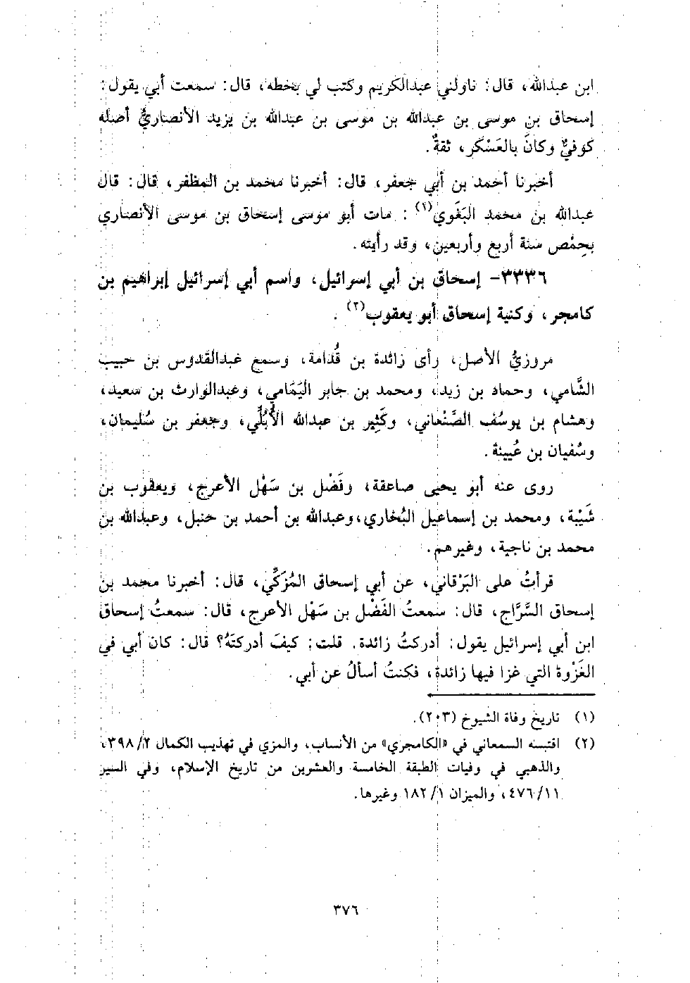 3336 - إسحاق بن أبي إسرائيل، واسم أبي إسرائيل إبراهيم بن كامجر وكنية إسحاق أبو يعقوب مروزي الأصل، رأى زائدة بن قدامة، وسمع: عبد القدوس بن حبيب الشامي، وحماد بن زيد، ومحمد بن جابر اليمامي، وعبد الوارث بن سعيد، وهشام بن يوسف الصنعاني، وكثير بن عبد الله الأبلي، وجعفر بن سليمان، وسفيان بن عيينة.