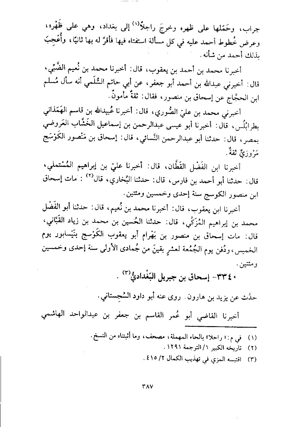 3340 - إسحاق بن جبريل البغدادي حدث عن يزيد بن هارون، روى عنه أبو داود السجستاني،