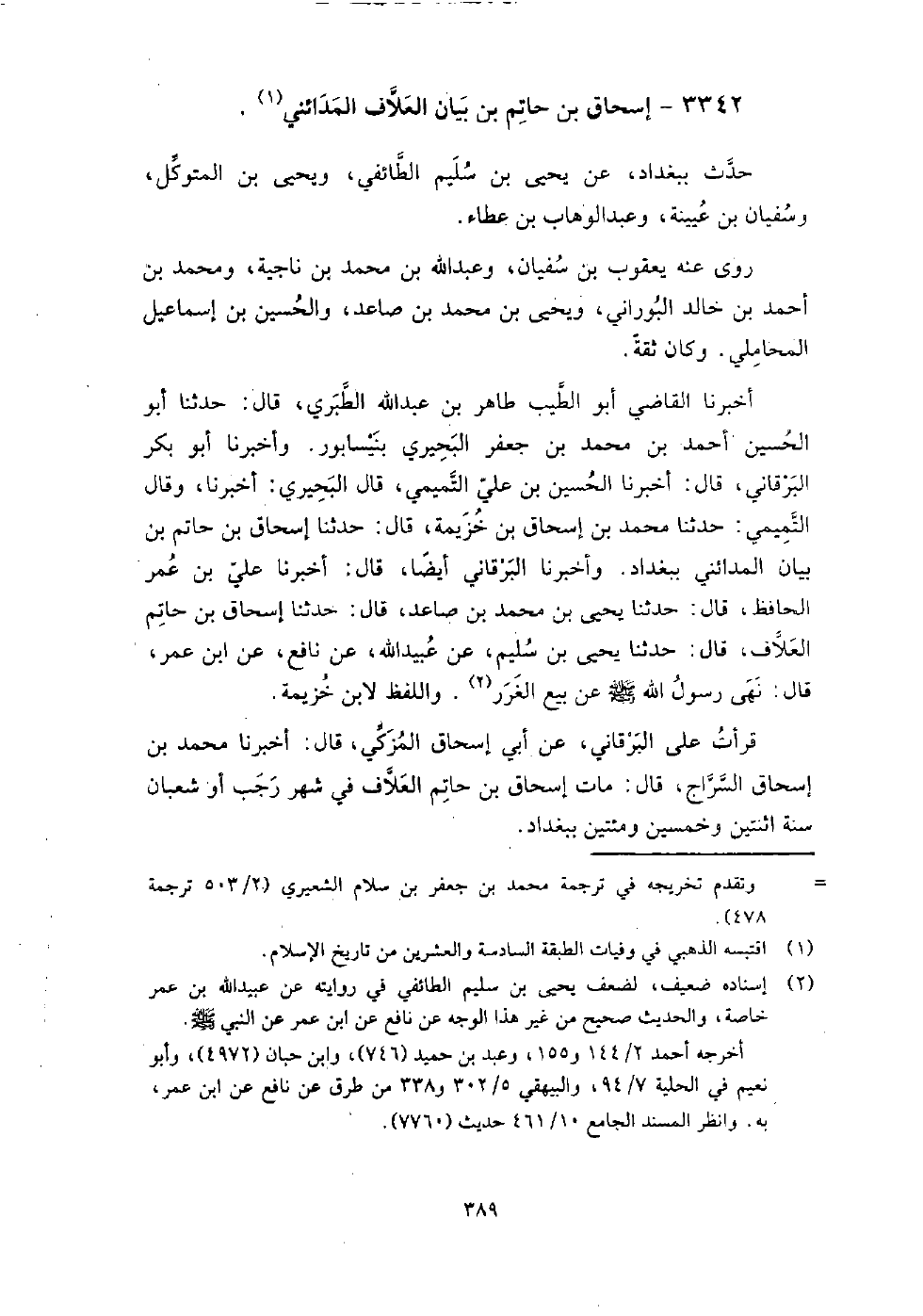 3342 - إسحاق بن حاتم بن بيان العلاف المدائني حدث ببغداد، عن يحيى بن سليم الطائفي، ويحيى بن المتوكل، وسفيان بن عيينة، وعبد الوهاب بن عطاء، روى عنه: يعقوب بن سفيان، وعبد الله بن محمد بن ناجية، ومحمد بن أحمد بن خالد البوراني، ويحيى بن محمد بن صاعد، والحسين بن إسماعيل المحاملي، وكان ثقة.