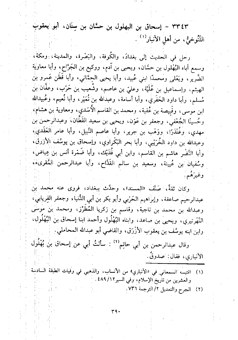 3343 - إسحاق بن البهلول بن حسان بن سنان أبو يعقوب التنوخي من أهل الأنبار رحل في الحديث إلى بغداد، والكوفة، والبصرة، والمدينة، ومكة، وسمع: أباه البهلول بن حسان، ويحيى بن آدم، ووكيع بن الجراح، وأبا معاوية الضرير، ويعلى ومحمدا ابني عبيد، وأبا يحيى الحماني، وأبا قطن عمرو بن الهيثم، وإسماعيل ابن علية، وعلي بن عاصم، وشعيب بن حرب، وعفان بن مسلم، وأبا داود الحفري، وأبا أسامة، وعبد الله بن نمير، وأبا نعيم، وعبيد الله بن موسى، وقبيصة بن عقبة، ومحمد بن القاسم الأسدي، ومعاوية بن هشام، وحسينا الجعفي، وجعفر بن عون، ويحيى بن سعيد القطان، وعبد الرحمن بن مهدي، وغندرا، ووهب بن جرير، وأبا عاصم النبيل، وأبا عامر العقدي، وعبد الله بن داود الخريبي، وأبا بحر البكراوي، وإسحاق بن يوسف الأزرق، وأبا النضر هاشم بن القاسم، وابن أبي فديك، وأبا ضمرة أنس بن عياض، وسفيان بن عيينة، وسعيد بن سالم القداح، وأبا عبد الرحمن المقرئ، وغيرهم.