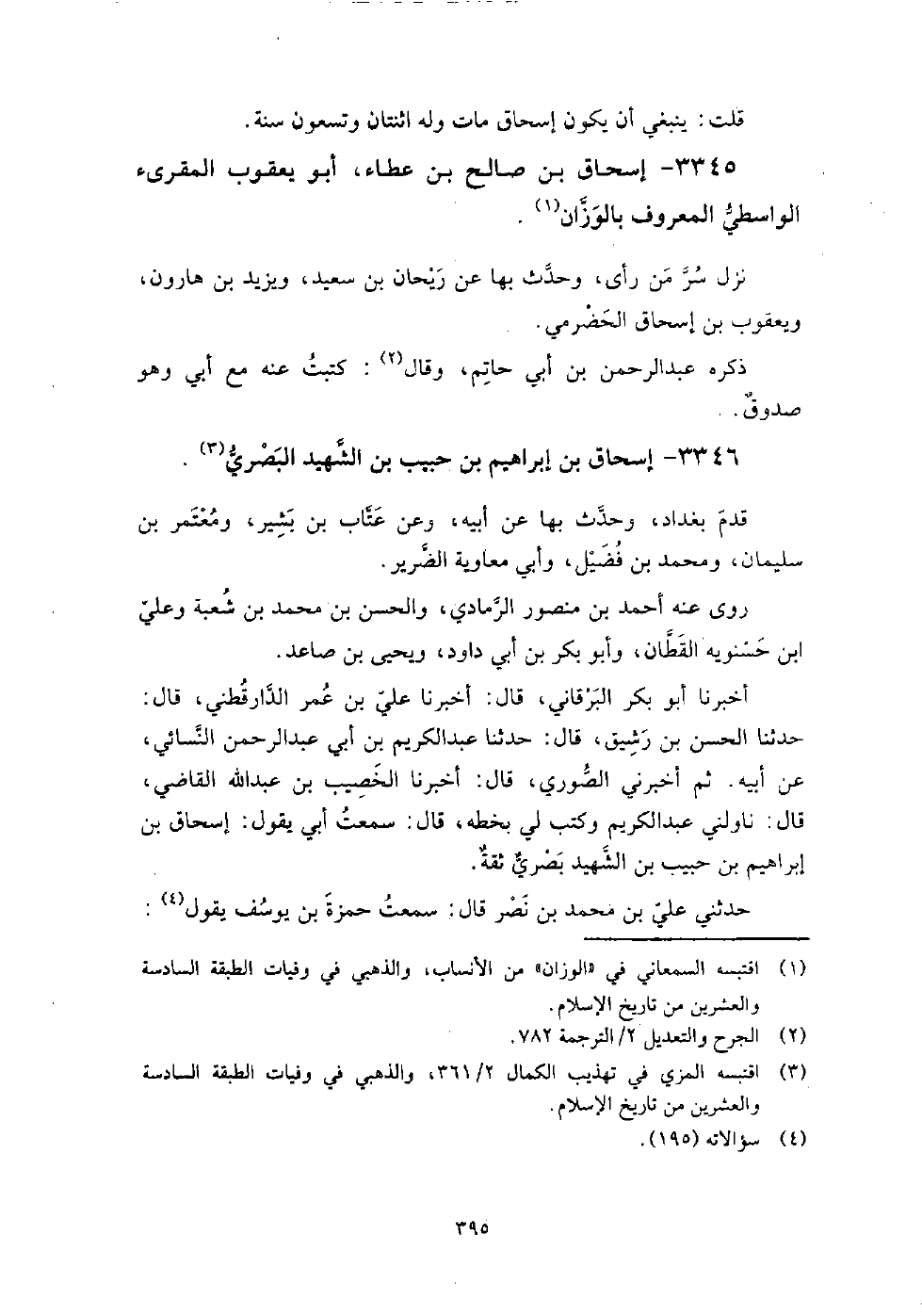 3345 - إسحاق بن صالح بن عطاء أبو يعقوب المقرئ الواسطي المعروف بالوزان نزل سر من رأى، وحدث بها عن ريحان بن سعيد، ويزيد بن هارون، ويعقوب بن إسحاق الحضرمي، ذكره عبد الرحمن بن أبي حاتم، وقال: كتبت عنه مع أبي وهو صدوق.
