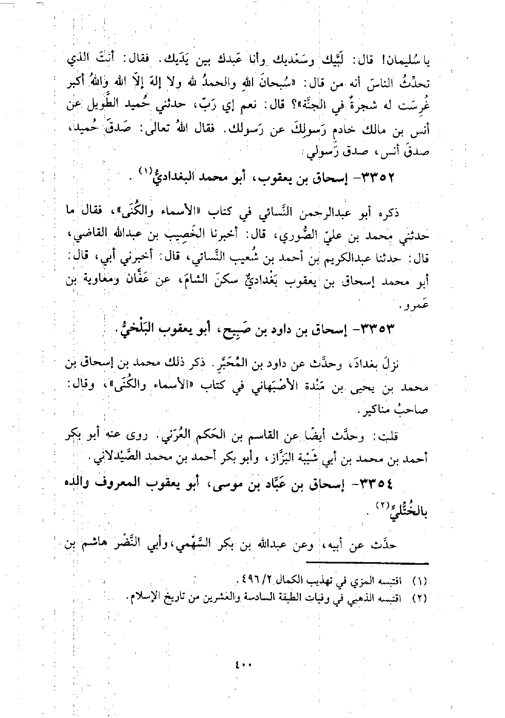3352 - إسحاق بن يعقوب أبو محمد البغدادي ذكره أبو عبد الرحمن النسائي في كتاب " الأسماء والكنى "، فقال ما حدثني محمد بن علي الصوري، قال: أخبرنا الخصيب بن عبد الله القاضي، قال: حدثنا عبد الكريم بن أحمد بن شعيب النسائي، قال: أخبرني أبي، قال: أبو محمد إسحاق بن يعقوب بغدادي سكن الشام، وحدث عن عفان، ومعاوية بن عمرو.