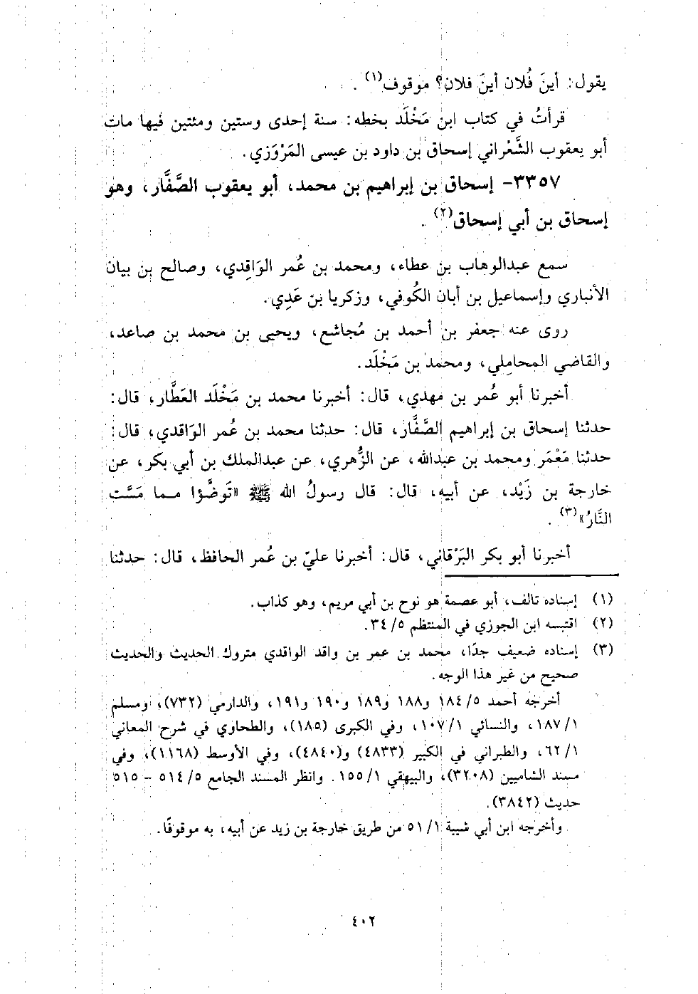 3357 - إسحاق بن إبراهيم بن محمد أبو يعقوب الصفار وهو إسحاق بن أبي إسحاق سمع: عبد الوهاب بن عطاء، ومحمد بن عمر الواقدي، وصالح بن بيان الأنباري وإسماعيل بن أبان الكوفي، وزكريا بن عدي، روى عنه: جعفر بن أحمد بن مجاشع، ويحيى بن محمد بن صاعد، والقاضي المحاملي، ومحمد بن مخلد.