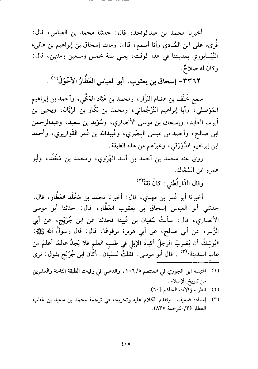 3362 - إسحاق بن يعقوب أبو العباس العطار الأحول سمع: خلف بن هشام البزار، ومحمد بن عباد المكي، وأحمد بن إبراهيم الموصلي، وأبا إبراهيم الترجماني، ومحمد بن بكار بن الريان، ويحيى بن أيوب العابد، وإسحاق بن موسى الأنصاري، وسويد بن سعيد، وعبد الرحمن بن صالح، وأحمد بن عيسى المصري، وعبيد الله بن عمر القواريري، وأحمد بن إبراهيم الدورقي، وغيرهم من هذه الطبقة، روى عنه: محمد بن أحمد بن أسد الهروي، ومحمد بن مخلد، وأبو عمرو ابن السماك، وقال الدارقطني: كان ثقة.