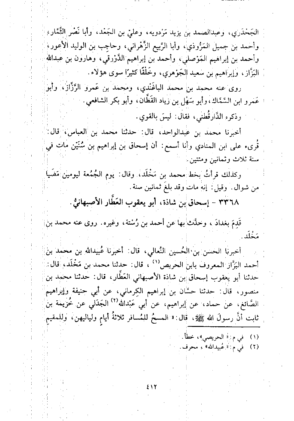 3368 - إسحاق بن شاذة أبو يعقوب العطار الأصبهاني قدم بغداد، وحدث بها عن أحمد بن رستة، وغيره، روى عنه محمد بن مخلد