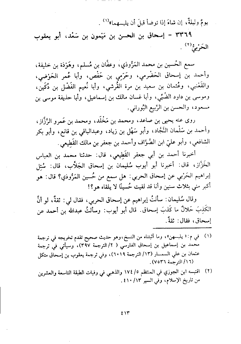 3369 - إسحاق بن الحسن بن ميمون بن سعد أبو يعقوب الحربي سمع: الحسين بن محمد المروذي، وعفان بن مسلم، وهوذة بن خليفة، وأحمد بن إسحاق الحضرمي، وحرمي بن حفص، وأبا عمر الحوضي، والقعنبي، وعثمان بن سعيد بن مرة القرشي، وأبا نعيم الفضل بن دكين، وموسى بن داود الضبي، وأبا غسان مالك بن إسماعيل، وأبا حذيفة موسى بن مسعود، والحسن بن الربيع البوراني.
