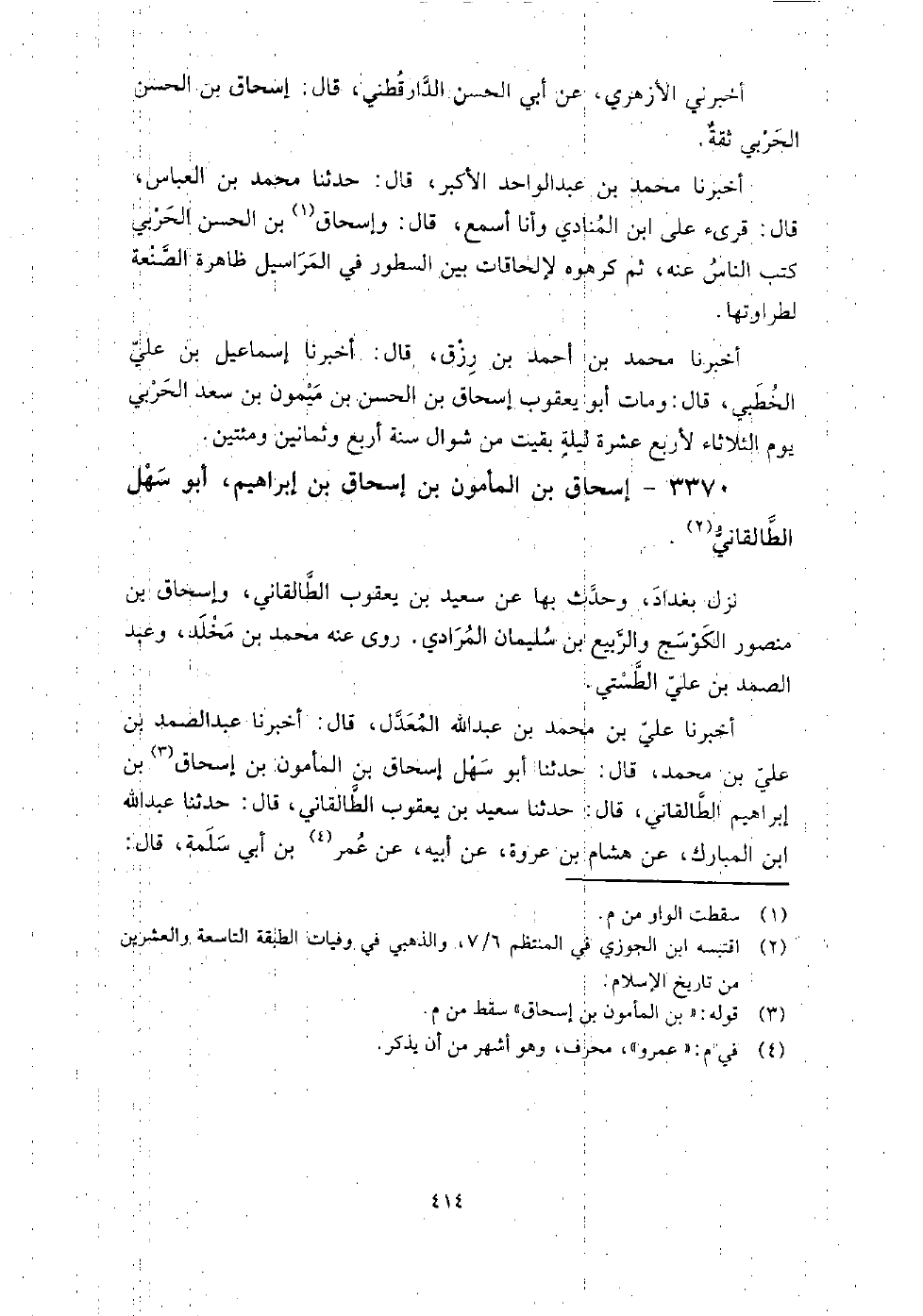 3370 - إسحاق بن المأمون بن إسحاق بن إبراهيم أبو سهل الطالقاني نزل بغداد، وحدث بها عن: سعيد بن يعقوب الطالقاني، وإسحاق بن منصور الكوسج، والربيع بن سليمان المرادي، روى عنه محمد بن مخلد، وعبد الصمد بن علي الطستي.