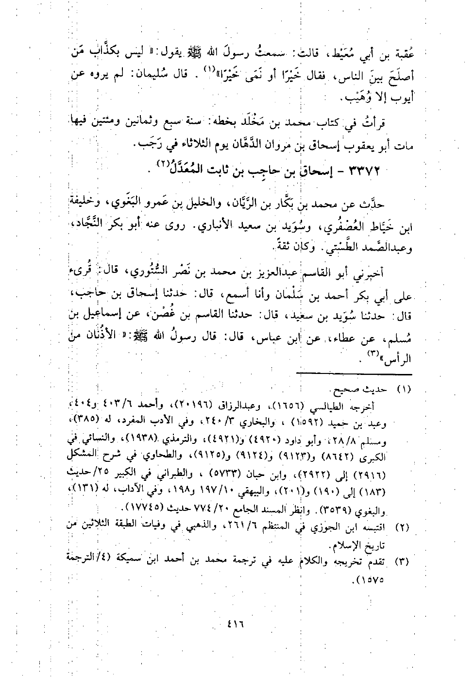 3372 - إسحاق بن حاجب بن ثابت المعدل حدث عن: محمد بن بكار بن الريان، والخليل بن عمرو البغوي، وخليفة بن خياط العصفري، وسويد بن سعيد الأنباري، روى عنه أبو بكر النجاد، وعبد الصمد الطستي، وكان ثقة