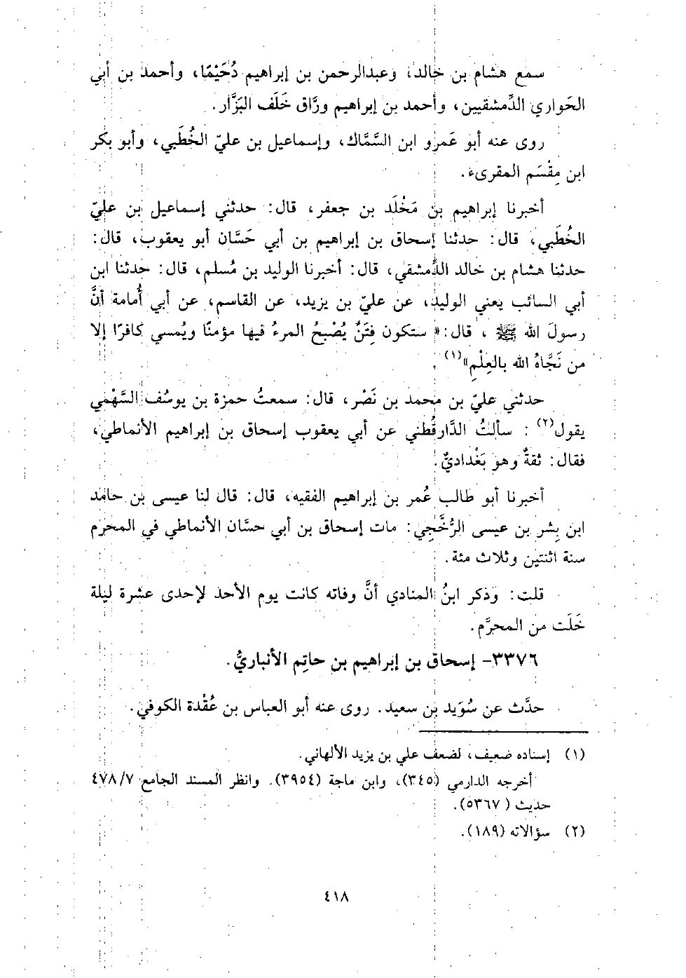 3376 - إسحاق بن إبراهيم بن حاتم الأنباري حدث عن سويد بن سعيد، روى عنه أبو العباس بن عقدة الكوفي.
