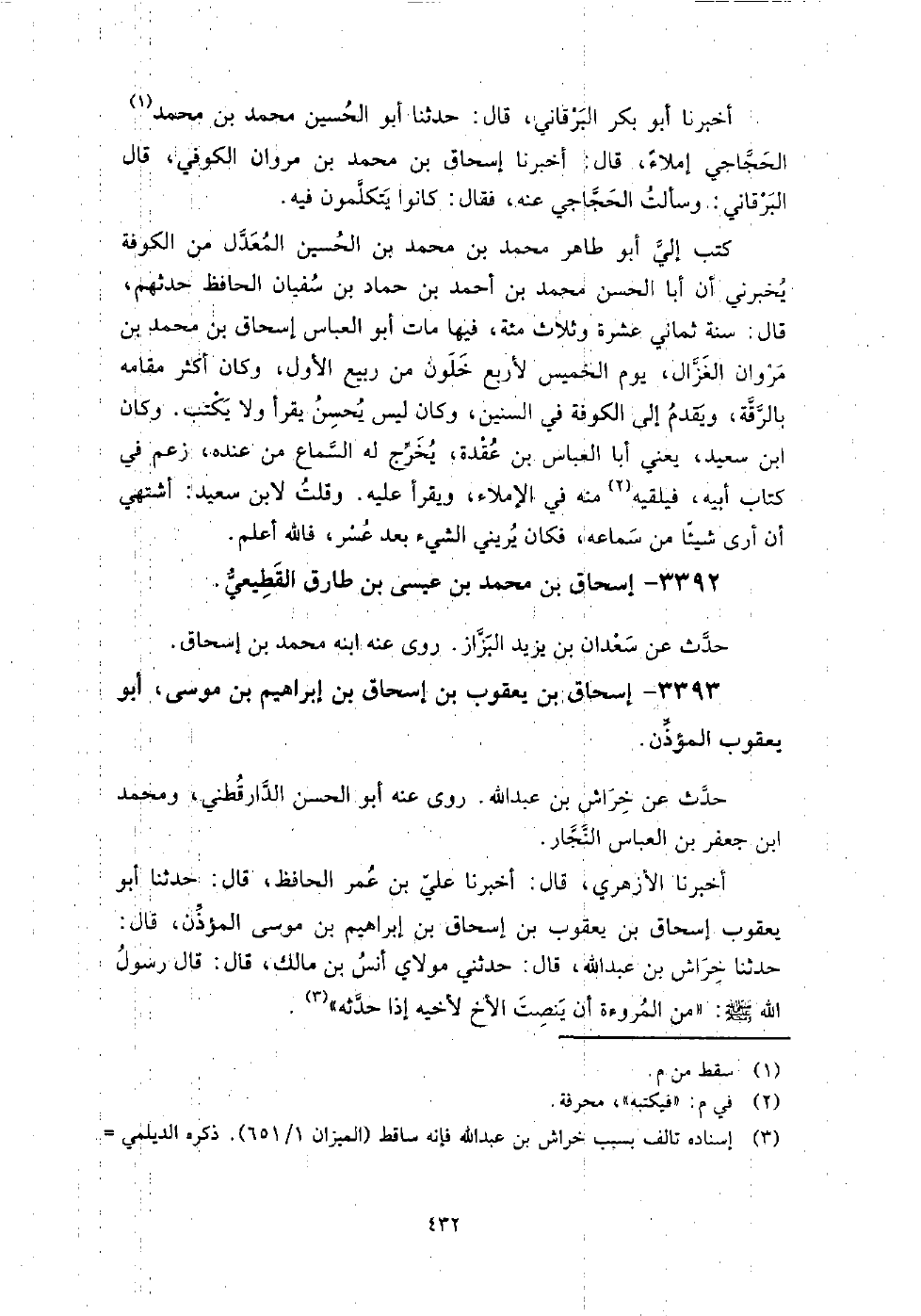 3392 - إسحاق بن محمد بن عيسى بن طارق القطيعي حدث عن سعدان بن يزيد البزاز، روى عنه ابنه محمد بن إسحاق
