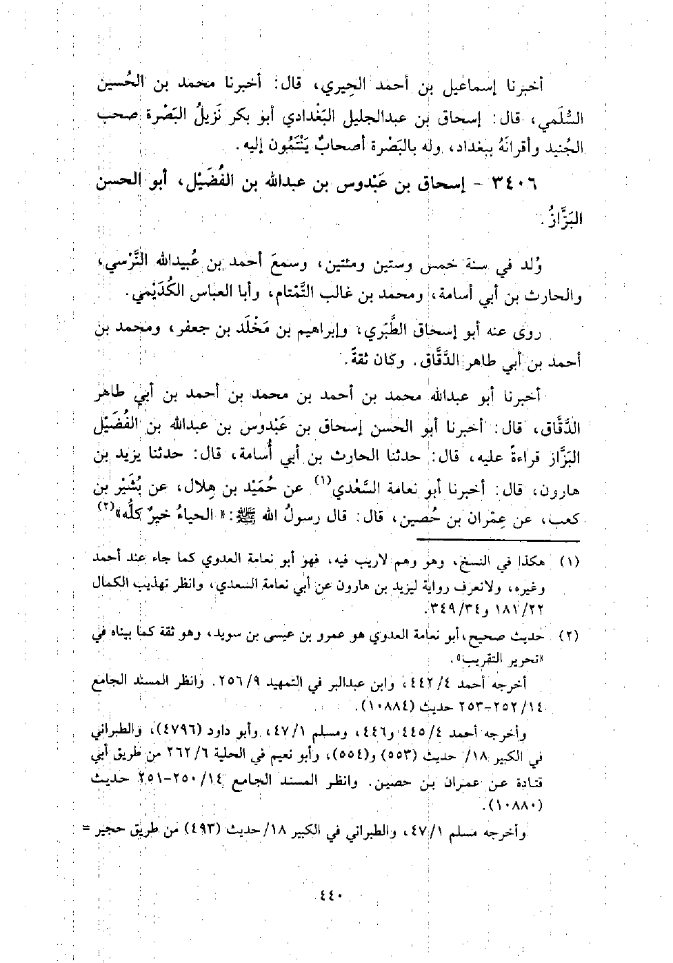 3406 - إسحاق بن عبدوس بن عبد الله بن الفضيل أبو الحسن البزاز ولد في سنة خمس وستين ومائتين، وسمع أحمد بن عبيد الله النرسي، والحارث بن أبي أسامة، ومحمد بن غالب التمتام، وأبا العباس الكديمي، روى عنه أبو إسحاق الطبري، وإبراهيم بن مخلد بن جعفر، ومحمد بن أحمد بن أبي طاهر الدقاق، وكان ثقة.