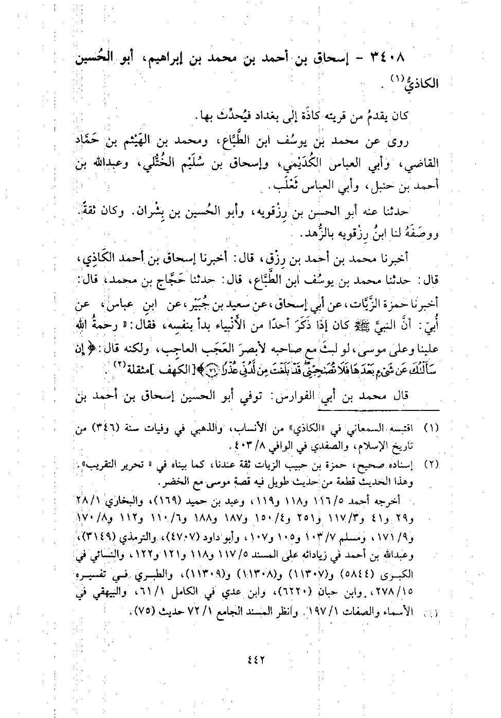 3408 - إسحاق بن أحمد بن محمد بن إبراهيم أبو الحسين الكاذي كان يقدم من قريته كاذة إلى بغداد فيحدث بها، روى عن: محمد بن يوسف ابن الطباع، ومحمد بن الهيثم بن حماد القاضي، وأبي العباس الكديمي، وإسحاق بن سليم الختلي، وعبد الله بن أحمد بن حنبل، وأبي العباس ثعلب.