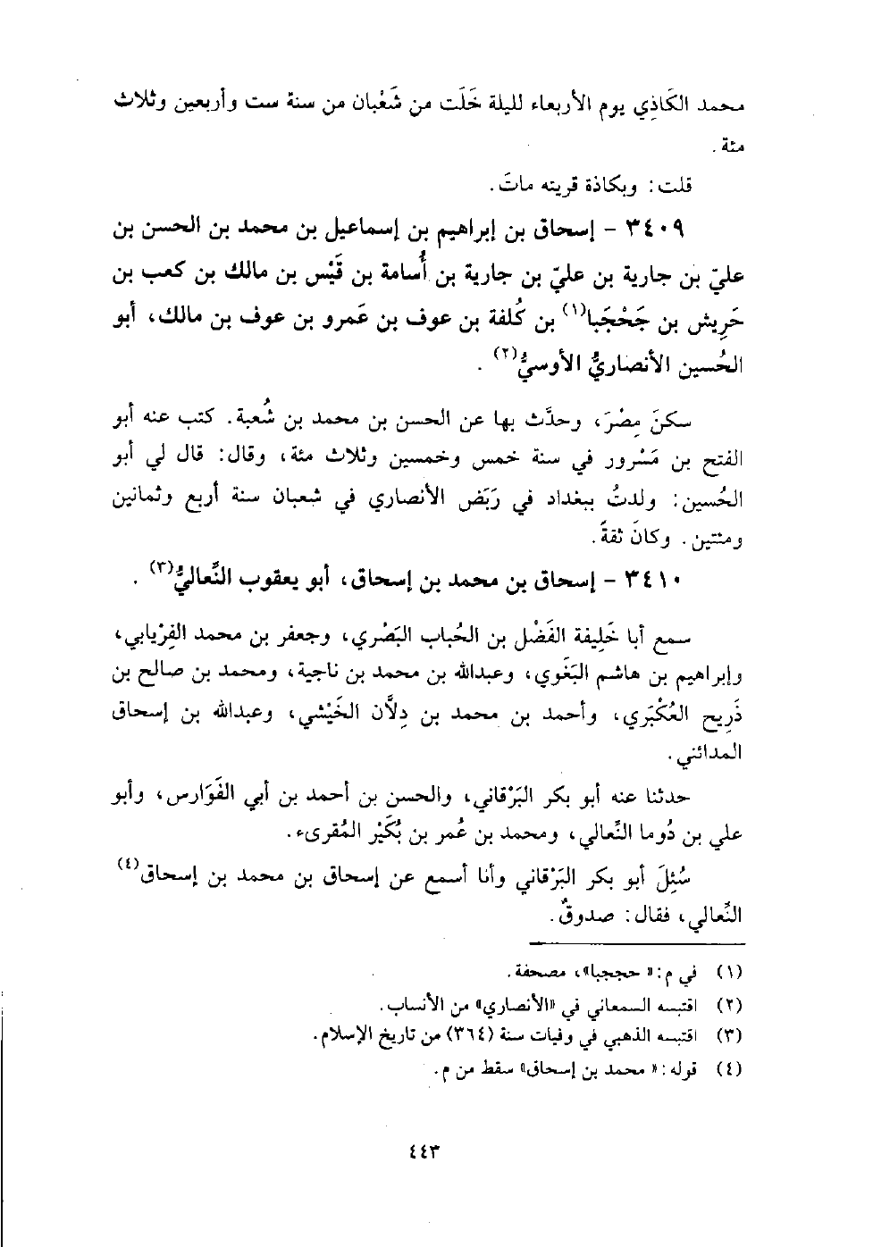 3410 - إسحاق بن محمد بن إسحاق أبو يعقوب النعالي سمع: أبا خليفة الفضل بن الحباب البصري، وجعفر بن محمد الفريابي، وإبراهيم بن هاشم البغوي، وعبد الله بن محمد بن ناجية، ومحمد بن صالح بن ذريح العكبري، وأحمد بن محمد بن دلان الخيشي، وعبد الله بن إسحاق المدائني.