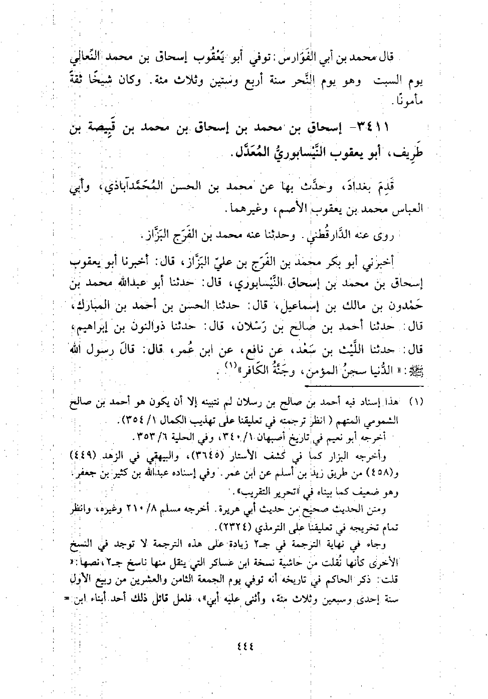 3411 - إسحاق بن محمد بن إسحاق بن محمد بن قبيصة بن طريف أبو يعقوب النيسابوري المعدل قدم بغداد، وحدث بها عن محمد بن الحسن المحمدآباذي، وأبي العباس محمد بن يعقوب الأصم، وغيرهما، روى عنه الدارقطني، وحدثنا عنه محمد بن الفرج البزاز.