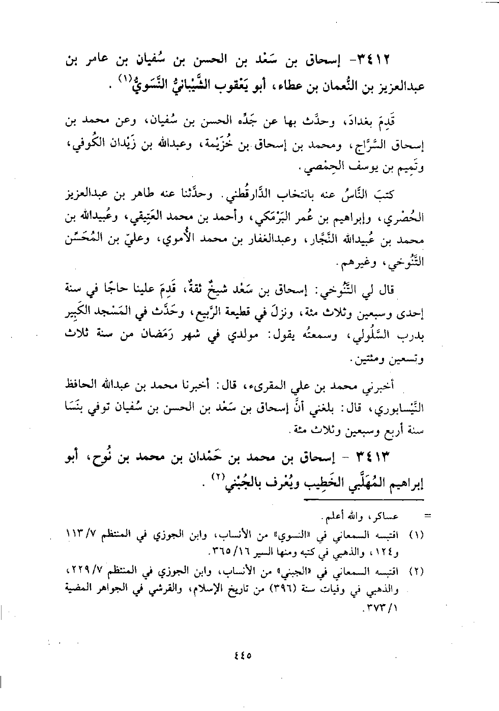 3412 - إسحاق بن سعد بن الحسن بن سفيان بن عامر بن عبد العزيز بن النعمان بن عطاء أبو يعقوب الشيباني النسوي قدم بغداد، وحدث بها عن جده الحسن بن سفيان، وعن محمد بن إسحاق السراج، ومحمد بن إسحاق بن خزيمة، وعبد الله بن زيدان الكوفي، وتميم بن يوسف الحمصي، كتب الناس عنه بانتخاب الدارقطني، وحدثنا عنه طاهر بن عبد العزيز الحصري، وإبراهيم بن عمر البرمكي، وأحمد بن محمد العتيقي، وعبيد الله بن محمد بن عبيد الله النجار، وعبد الغفار بن محمد الأموي، وعلي بن المحسن التنوخي، وغيرهم.