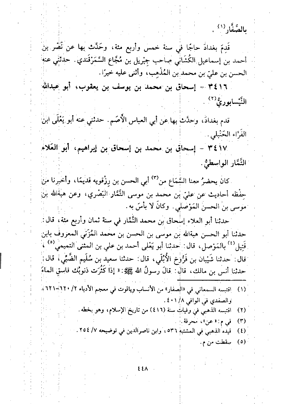3416 - إسحاق بن محمد بن يوسف بن يعقوب أبو عبد الله النيسابوري قدم بغداد، وحدث بها عن أبي العباس الأصم، حدثني عنه أبو يعلى بن الفراء الحنبلي.