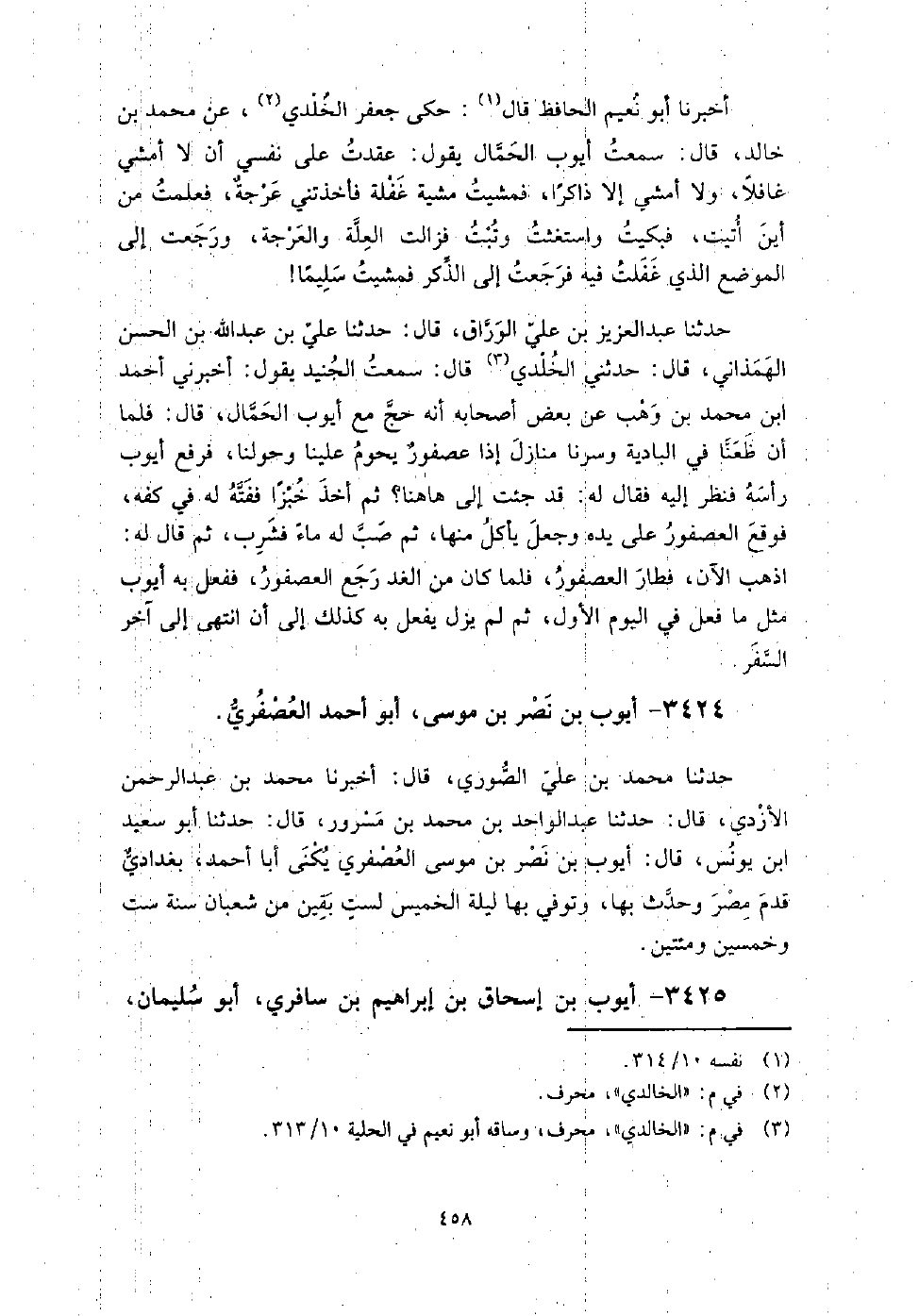 3424 - أيوب بن نصر بن موسى أبو أحمد العصفري حدثنا محمد بن علي الصوري، قال: أخبرنا محمد بن عبد الرحمن الأزدي، قال: حدثنا عبد الواحد بن محمد بن مسرور، قال: حدثنا أبو سعيد بن يونس، قال: أيوب بن نصر بن موسى العصفري، يكنى أبا أحمد، بغدادي قدم مصر وحدث بها، وتوفي بها ليلة الخميس لست بقين من شعبان سنة ست وخمسين ومائتين.