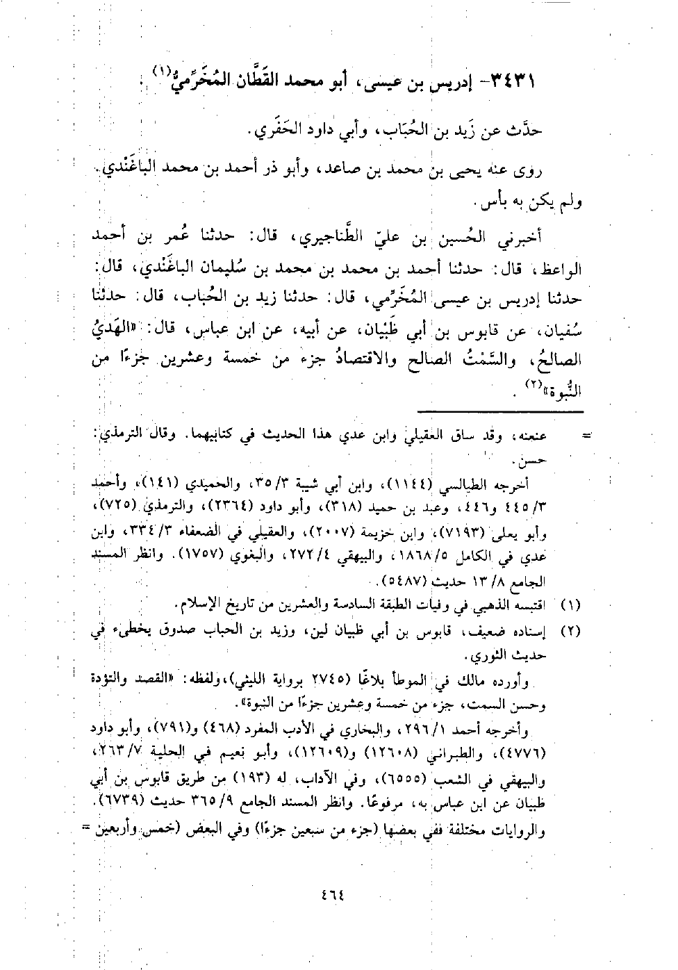 3431 - إدريس بن عيسى أبو محمد القطان المخرمي حدث عن زيد بن الحباب، وأبي داود الحفري، روى عنه يحيى بن محمد بن صاعد، وأبو ذر أحمد بن محمد الباغندي، ولم يكن به بأس.