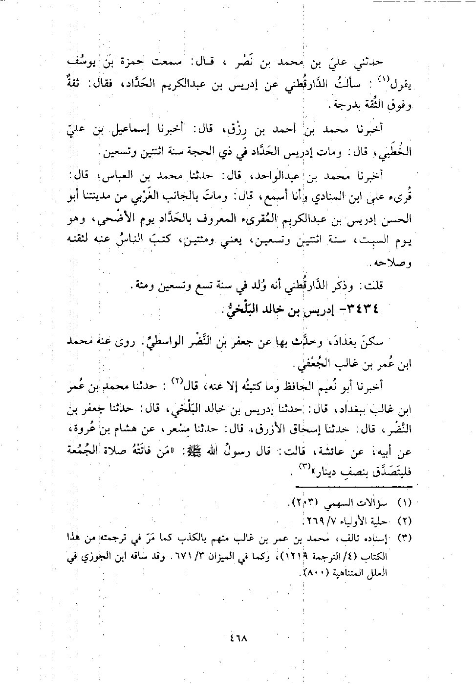 3434 - إدريس بن خالد البلخي سكن بغداد، وحدث بها عن جعفر بن النضر الواسطي، روى عنه محمد بن عمر بن غالب الجعفي
