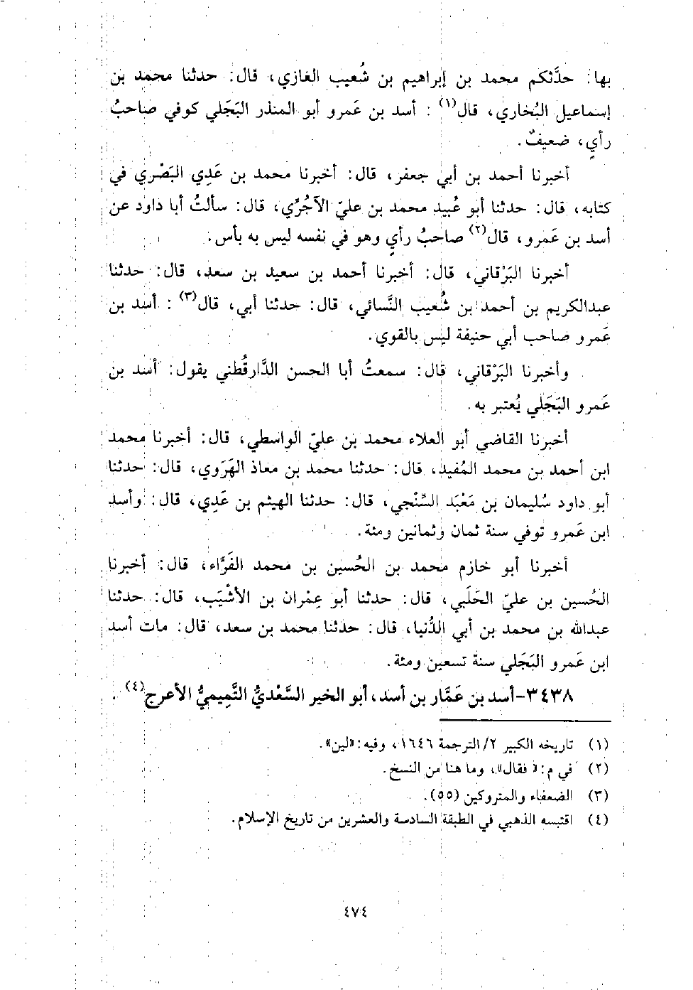 3438 - أسد بن عمار بن أسد أبو الخير السعدي التميمي الأعرج حدث عن: الحسين بن علي الجعفي، ويزيد بن هارون، وروح بن عبادة، وعبد الله بن صالح العجلي، وموسى بن إسماعيل التبوذكي، وهدبة بن خالد، روى عنه: عبد الله بن أبي سعد الوراق، وأبو بكر بن أبي الدنيا، وأبو جعفر الحضرمي مطين، وأبو حامد محمد بن هارون الحضرمي، وقال مطين: حدثنا أبو الخير أسد بن عمار البغدادي.