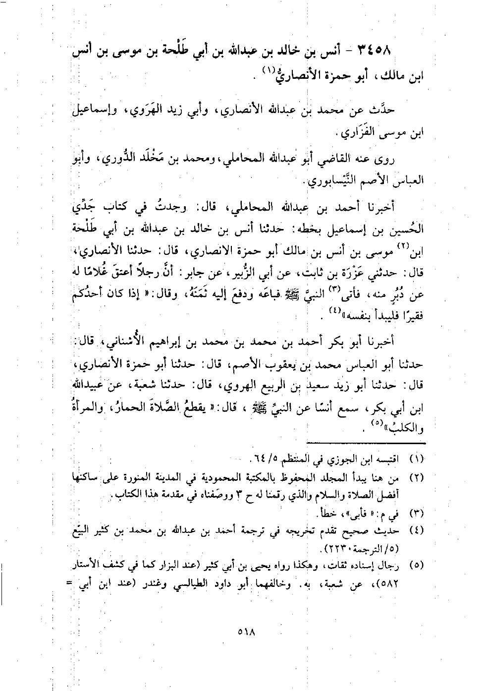 3458 - أنس بن خالد بن عبد الله بن أبي طلحة بن موسى بن أنس بن مالك أبو حمزة الأنصاري حدث عن: محمد بن عبد الله الأنصاري، وأبي زيد الهروي، وإسماعيل بن موسى الفزاري، روى عنه: القاضي أبو عبد الله المحاملي، ومحمد بن مخلد الدوري، وأبو العباس الأصم النيسابوري.