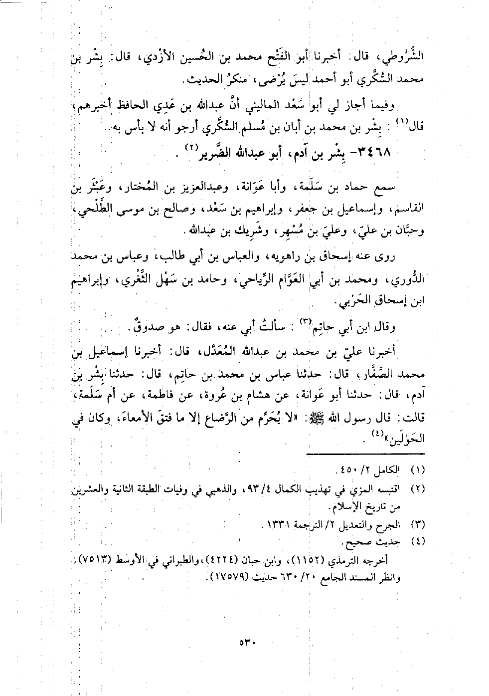 3468 - بشر بن آدم أبو عبد الله الضرير سمع: حماد بن سلمة، وأبا عوانة، وعبد العزيز بن المختار، وعبثر بن القاسم، وإسماعيل بن جعفر، وإبراهيم بن سعد، وصالح بن موسى الطلحي، وحبان بن علي، وعلي بن مسهر، وشريك بن عبد الله، روى عنه: إسحاق بن راهويه، والعباس بن أبي طالب، وعباس بن محمد الدوري، ومحمد بن أبي العوام الرياحي، وحامد بن سهل الثغري، وإبراهيم بن إسحاق الحربي، وقال ابن أبي حاتم: سألت أبي عنه، فقال: هو صدوق.