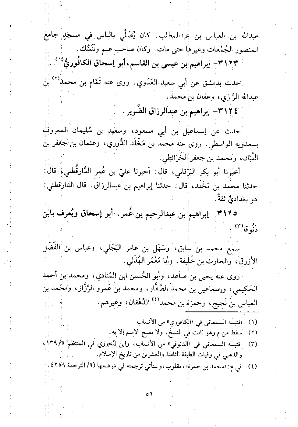 3125 - إبراهيم بن عبد الرحيم بن عمر أبو إسحاق ويعرف بابن دَنُوقا سمع: محمد بن سابق، وسهل بن عامر البجلي، وعباس بن الفضل الأزرق، والحارث بن خليفة، وأبا معمر الهذلي، روى عنه: يحيى بن صاعد، وأبو الحسين ابن المنادي، ومحمد بن أحمد الحكيمي، وإسماعيل بن محمد الصفار، ومحمد بن عمرو الرزاز، ومحمد بن العباس بن نجيح، وحمزة بن محمد الدهقان، وغيرهم، وقال الدارقطني: هو ثقة.