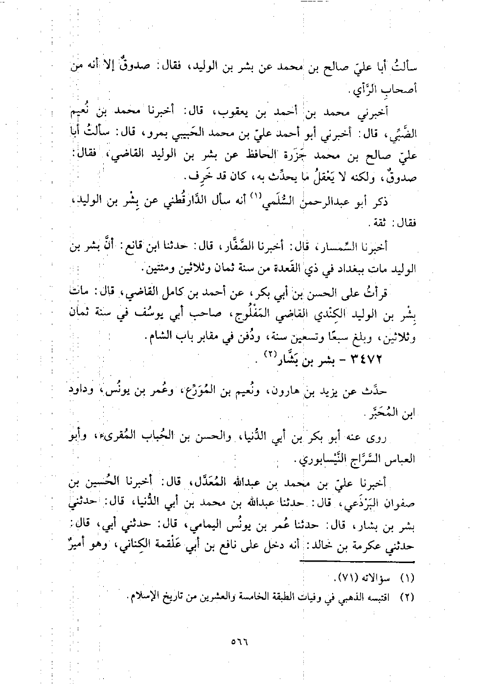 3472 - بشر بن بشار حدث عن: يزيد بن هارون، ونعيم بن المورع، وعمر بن يونس، وداود بن المحبر، روى عنه: أبو بكر بن أبي الدنيا، والحسن بن الحباب المقرئ، وأبو العباس السراج النيسابوري أخبرنا علي بن محمد بن عبد الله المعدل، قال: أخبرنا الحسين بن صفوان البرذعي، قال: حدثنا عبد الله بن محمد بن أبي الدنيا، قال: حدثني بشر بن بشار، قال: حدثنا عمر بن يونس اليمامي، قال: حدثني أبي، قال: حدثني عكرمة بن خالد أنه دخل على نافع بن أبي علقمة الكناني، وهو أمير على مكة يعوده فرآه ثقيلا، فقال له: اتق الله وأكثر ذكره، فولى بوجهه إلى الجدار فلبث ساعة ثم أقبل علي، فقال: يا أبا خالد ما أنكر ما تقول، فلوددت أني كنت عبدا مملوكا لبني فلان من كنانة أشقى أهل بيت من كنانة، وأني لم أَلِ من هذا العمل شيئا قط