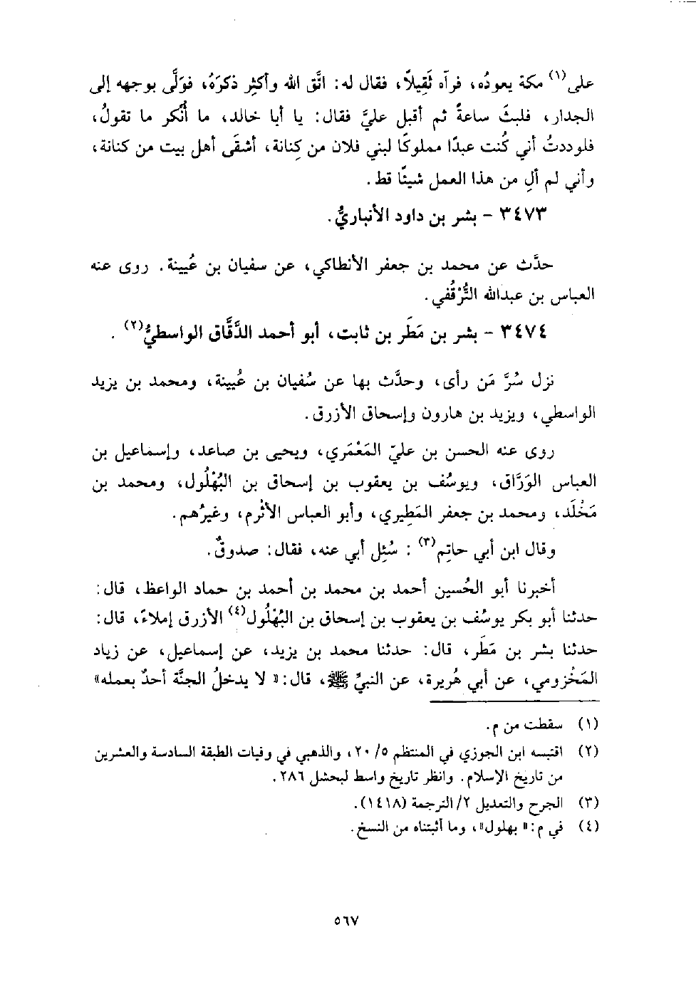 3474 - بشر بن مطر بن ثابت أبو أحمد الدقاق الواسطي نزل سر من رأى، وحدث بها عن: سفيان بن عيينة، ومحمد بن يزيد الواسطي، ويزيد بن هارون، وإسحاق الأزرق روى عنه: الحسن بن علي المعمري، ويحيى بن صاعد، وإسماعيل بن العباس الوراق، ويوسف بن يعقوب بن إسحاق بن البهلول، ومحمد بن مخلد، ومحمد بن جعفر المطيري، وأبو العباس الأثرم، وغيرهم، وقال ابن أبي حاتم سئل أبي عنه، فقال: صدوق