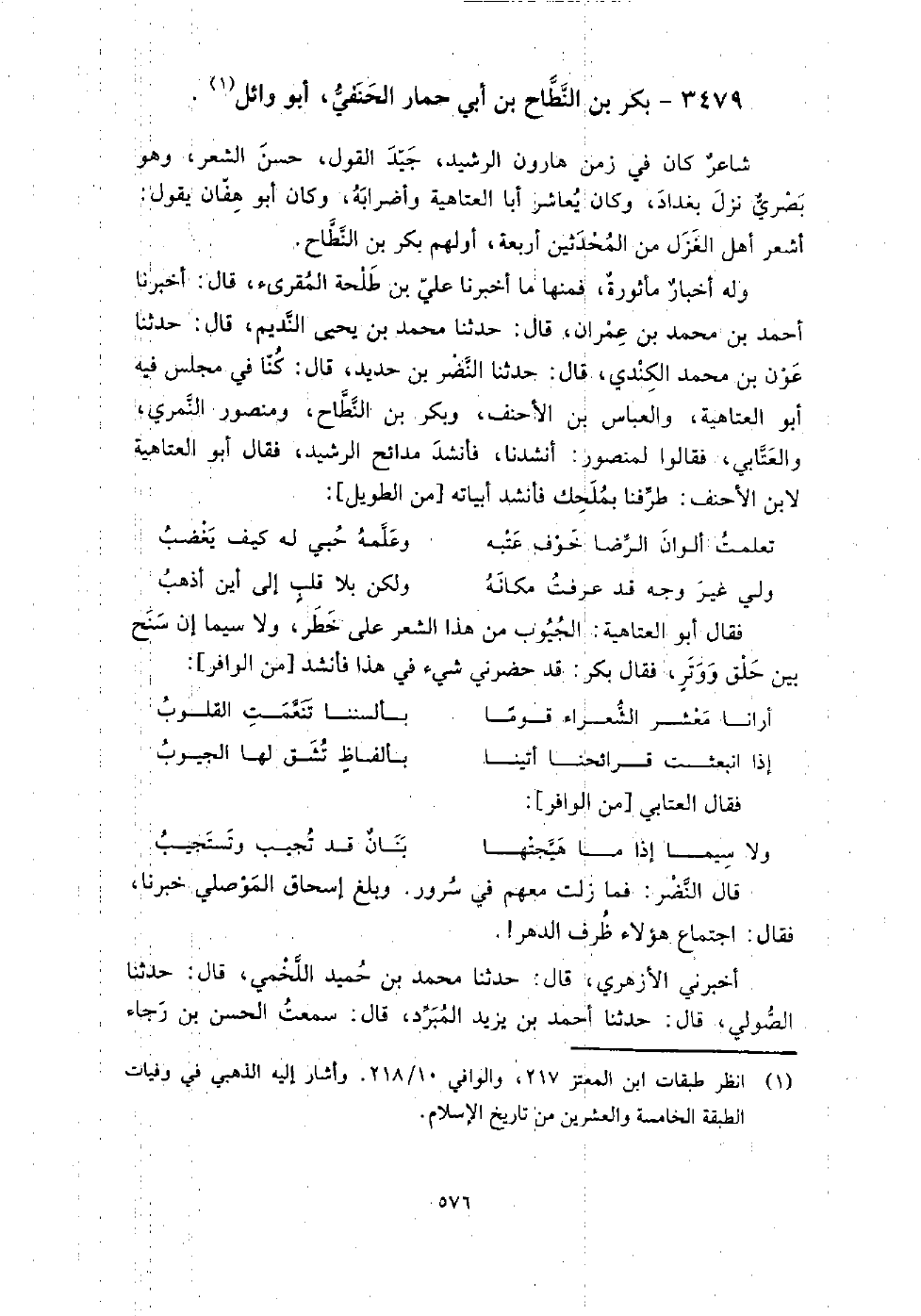 3479 - بكر بن النطاح بن أبي حمار الحنفي أبو وائل شاعر كان في زمن هارون الرشيد، جيد القول، حسن الشعر، وهو بصري نزل بغداد، وكان يعاشر أبا العتاهية وأضرابه، وكان أبو هفان يقول: أشعر أهل الغزل من المحدثين أربعة، أولهم بكر بن النطاح وله أخبار مأثورة، فمنها ما أخبرنا علي بن طلحة المقرئ، قال: أخبرنا أحمد بن محمد بن عمران، قال: حدثنا محمد بن يحيى النديم، قال: حدثنا عون بن محمد الكندي، قال: حدثنا النضر بن حديد، قال: كنا في مجلس فيه أبو العتاهية، والعباس بن الأحنف، وبكر بن النطاح، ومنصور النمري، والعتابي، فقالوا لمنصور: أنشدنا فأنشد مدائح الرشيد، فقال أبو العتاهية لابن الأحنف: طرفنا بملحك، فأنشد أبياته:
