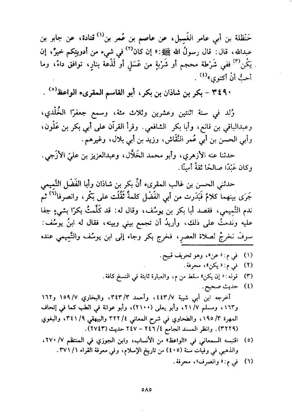 3490 - بكر بن شاذان بن بكر أبو القاسم المقرئ الواعظ ولد في سنة اثنتين وعشرين وثلاث مائة، وسمع: جعفرا الخلدي، وعبد الباقي بن قانع، وأبا بكر الشافعي، وقرأ القرآن على أبي بكر بن علون، وأبي الحسن بن أبي عمر النقاش، وزيد بن أبي بلال، وغيرهم، حدثنا عنه الأزهري، وأبو محمد الخلال، وعبد العزيز بن علي الأزجي، وكان عبدا صالحا ثقة أمينا حدثني الحسن بن غالب المقرئ، أن بكر بن شاذان وأبا الفضل التميمي جرى بينهما كلام، فبدرت من أبي الفضل كلمة ثقلت على بكر وانصرفا، ثم ندم التميمي، فقصد أبا بكر بن يوسف، وقال له: قد كلمت بكرا بشيء جفا عليه وندمت على ذلك، وأريد أن تجمع بيني وبينه، فقال له ابن يوسف: سوف نخرج لصلاة العصر، فخرج بكر، وجاء إلى ابن يوسف، والتميمي عنده، فقال له التميمي: أسألك أن تجعلني في حل، فقال بكر: سبحان الله، والله ما فارقتك حتى حللتك وانصرف، فقال التميمي: قال لي والدي: يا عبد الواحد احذر أن تخاصم من إذا نمت كان منتبها، قال ابن غالب: وكان لبكر ورد من الليل لا يخل به حدثني أحمد بن محمد العتيقي والتنوخي: أن بكر بن شاذان توفي في يوم السبت التاسع من شوال من سنة خمس وأربع مائة، وقال لي عبد العزيز بن علي: مات بكر بن شاذان الواعظ في شوال من سنة خمس وأربع مائة، وله نيف وثمانون سنة، قال عبد العزيز: وقيل: إنه لم تفته جمعة قط إلا الجمعة التي مات في غدها، وكان موته غداة يوم السبت، وحدثني الخلال: أن بكرا دفن في مقبرة باب حرب