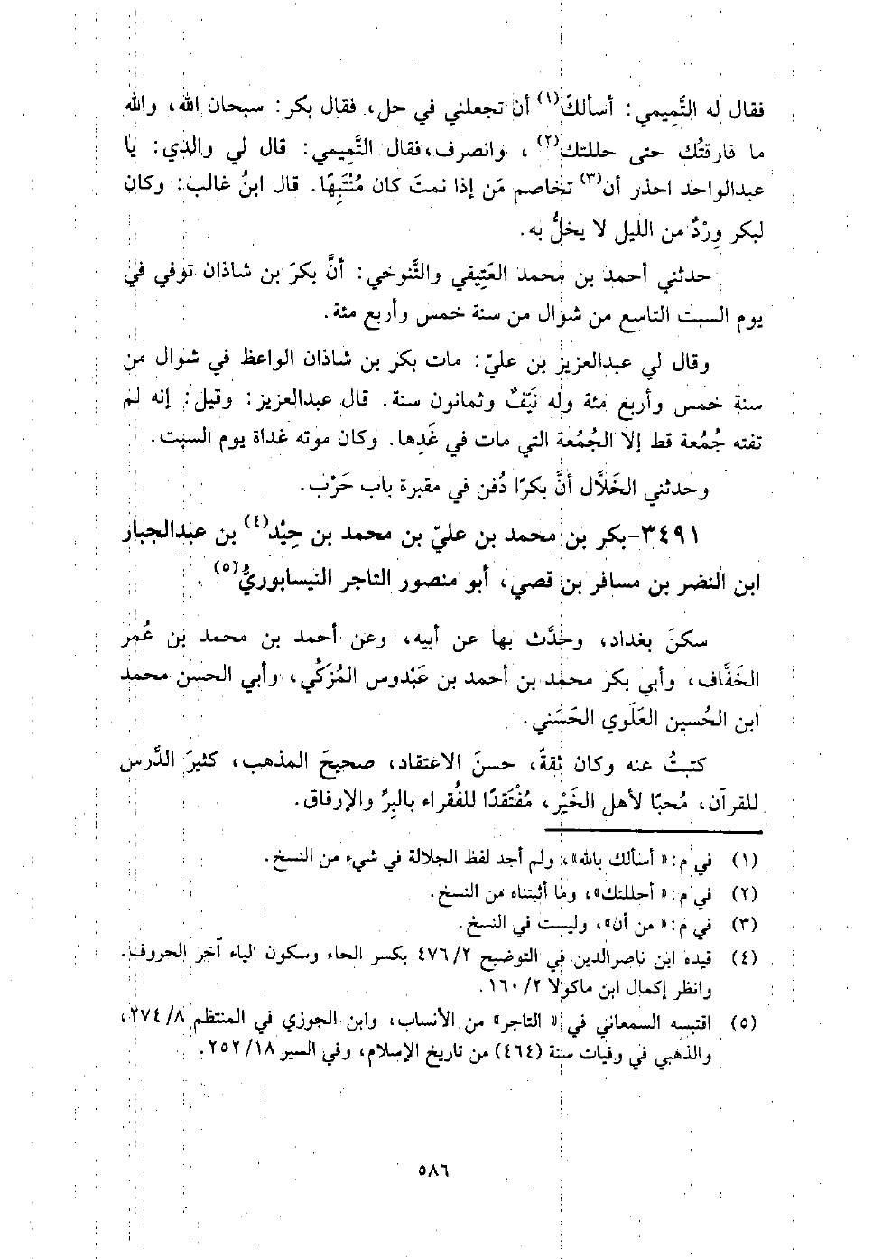 3491 - بكر بن محمد بن علي بن محمد بن حيد بن عبد الجبار بن النضر بن مسافر بن قصي أبو منصور التاجر النيسابوري سكن بغداد، وحدث بها عن أبيه، وعن أحمد بن محمد بن عمر الخفاف، وأبي بكر محمد بن أحمد بن عبدوس المزكي، وأبي الحسن محمد بن الحسين العلوي الحسني، كتبت عنه، وكان ثقة، حسن الاعتقاد، صحيح المذهب كثير الدرس للقرآن محبا لأهل الخير، مفتقدا للفقراء بالبر والإرفاق.