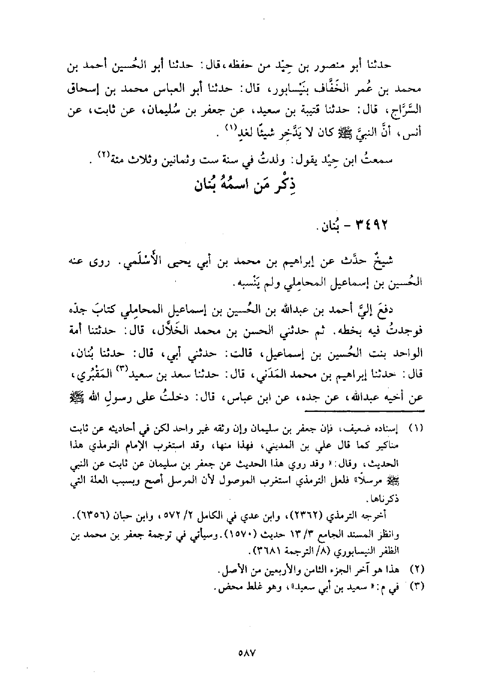 3492 - بنان شيخ حدث عن إبراهيم بن محمد بن أبي يحيى الأسلمي، روى عنه الحسين بن إسماعيل المحاملي ولم ينسبه