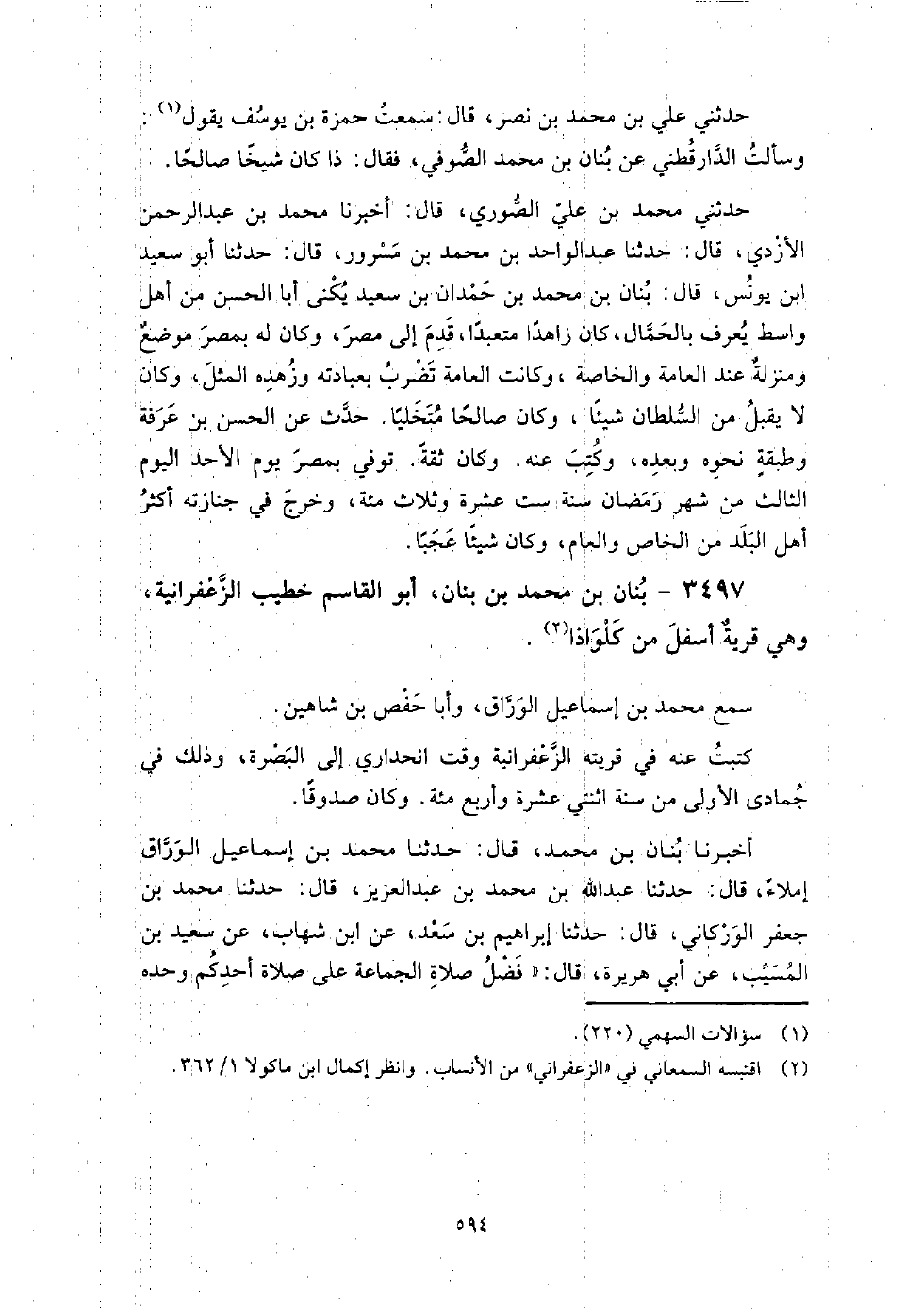 3497 - بنان بن محمد بن بنان أبو القاسم خطيب الزعفرانية وهي قرية أسفل من كلواذا سمع محمد بن إسماعيل الوراق، وأبا حفص بن شاهين، كتبت عنه في قريته الزعفرانية وقت انحداري إلى البصرة، وذلك في جمادى الأولى من سنة اثنتي عشرة وأربع مائة، وكان صدوقا