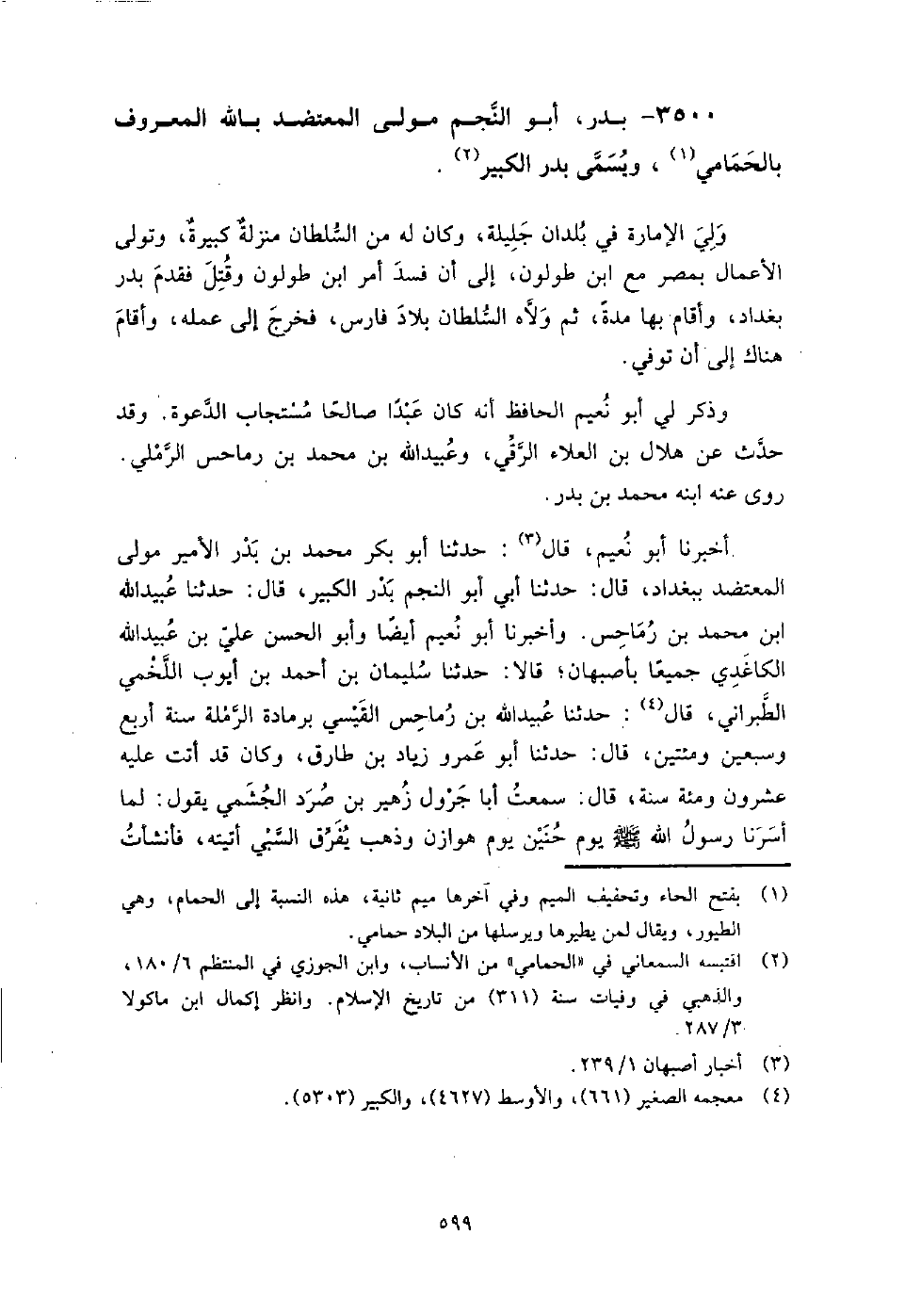 3500 - بدر أبو النجم مولى المعتضد بالله المعروف بالحمامي ويسمى بدر الكبير ولي الإمارة في بلدان جليلة، وكان له من السلطان منزلة كبيرة، وتولى الأعمال بمصر مع ابن طولون إلى أن فسد أمر ابن طولون، وقتل فقدم بدر بغداد، وأقام بها مدة، ثم ولاه السلطان بلاد فارس، فخرج إلى عمله، وأقام هناك إلى أن توفي.