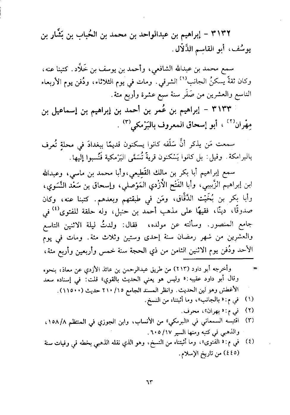 3133 - إبراهيم بن عمر بن أحمد بن إبراهيم بن إسماعيل بن مهران أبو إسحاق المعروف بالبرمكي سمعت من يذكر أن سلفه كانوا يسكنون قديما ببغداد في محلة تعرف بالبرامكة، وقيل: بل كانوا يسكنون قرية تسمى البرمكية فنسبوا إليها.