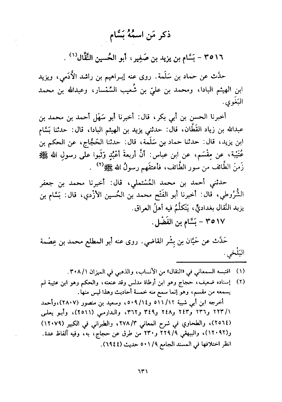 3516 - بسام بن يزيد بن صغير أبو الحسين النقال حدث عن حماد بن سلمة، روى عنه: إبراهيم بن راشد الأدمي، ويزيد بن الهيثم البادا، ومحمد بن علي بن شعيب السمسار، وعبد الله بن محمد البغوي.