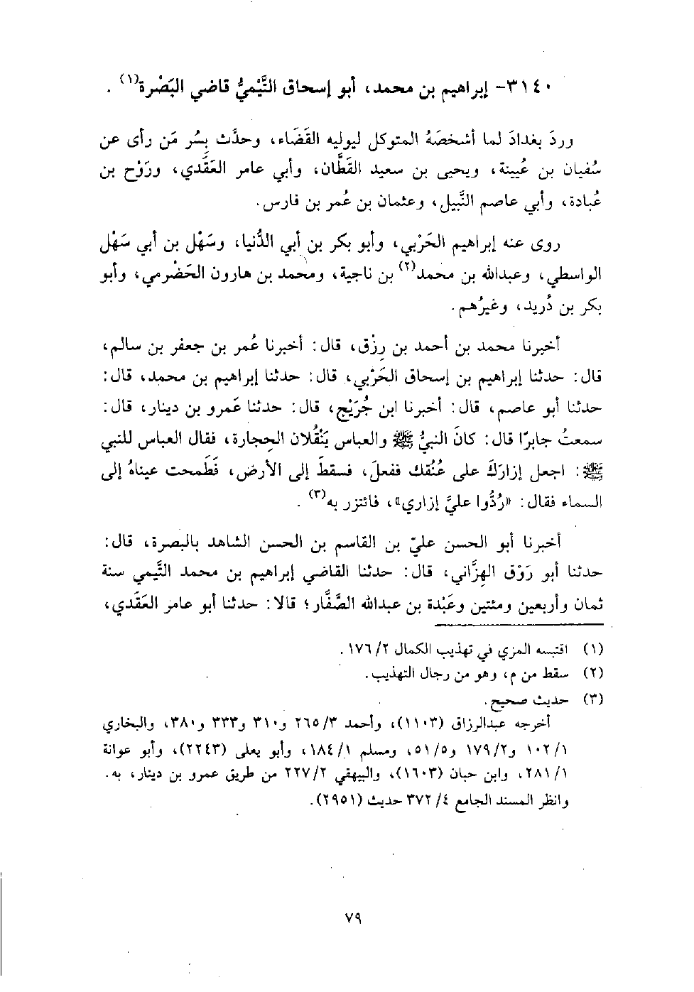 3140 - إبراهيم بن محمد أبو إسحاق التيمي قاضى البصرة ورد بغداد لما أشخصه المتوكل ليوليه القضاء، وحدث بسر من رأى عن سفيان بن عيينة، ويحيى بن سعيد القطان، وأبي عامر العقدي، وروح بن عبادة، وأبي عاصم النبيل، وعثمان بن عمر بن فارس.