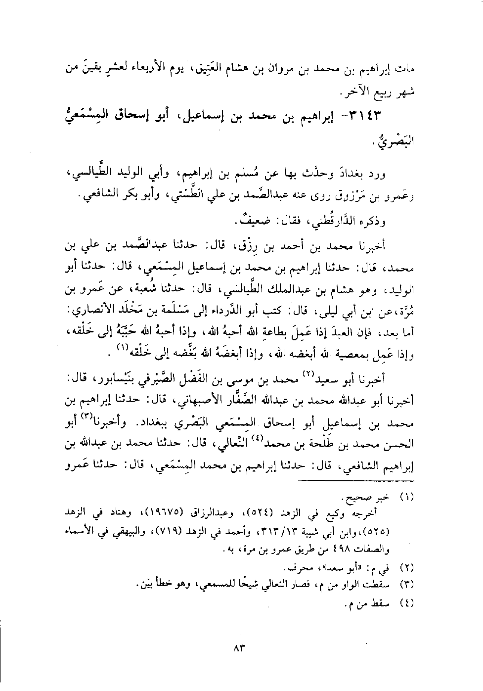 3143 - إبراهيم بن محمد بن إسماعيل أبو إسحاق المسمعي البصري ورد بغداد، وحدث بها عن مسلم بن إبراهيم، وأبي الوليد الطيالسي، وعمرو بن مرزوق، روى عنه عبد الصمد بن علي الطستي، وأبو بكر الشافعي، وذكره الدارقطني، فقال: ضعيف.