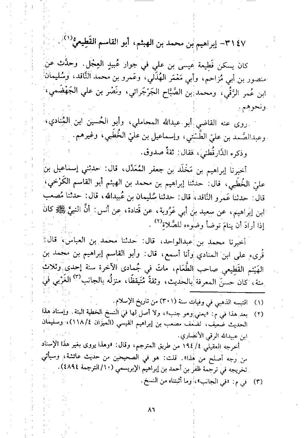 3147 - إبراهيم بن محمد بن الهيثم أبو القاسم القطيعي كان يسكن قطيعة عيسى بن علي في جوار عبيد العجل، وحدث عن: منصور بن أبي مزاحم، وأبي معمر الهذلي، وعمرو بن محمد الناقد، وسليمان بن عمر الرقى، ومحمد بن الصباح الجرجرائي، ونصر بن علي الجهضمي، ونحوهم.
