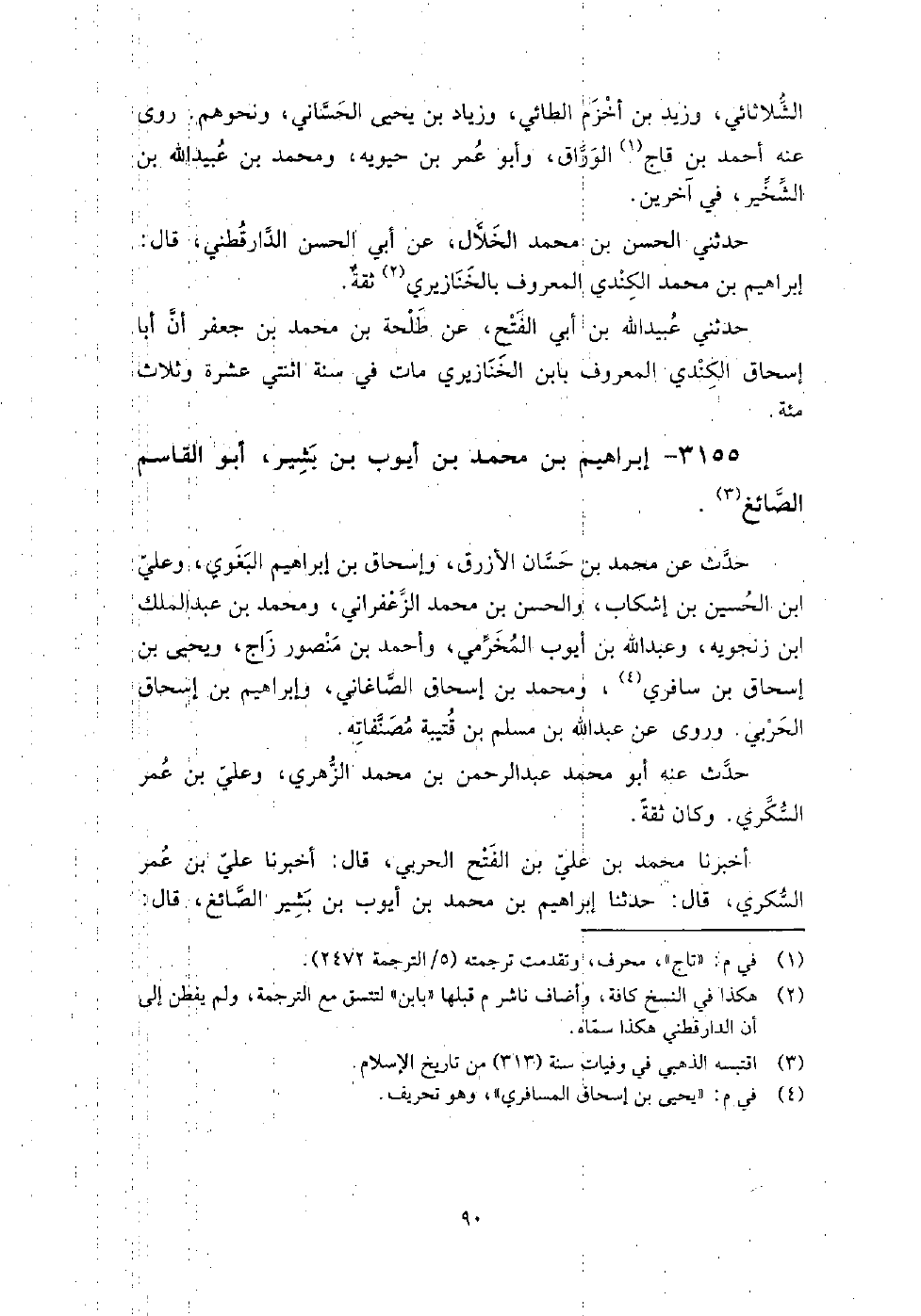 3155 - إبراهيم بن محمد بن أيوب بن بشير أبو القاسم الصائغ حدث عن: محمد بن حسان الأزرق، وإسحاق بن إبراهيم البغوي، وعلي بن الحسين بن إشكاب، والحسن بن محمد الزعفراني، ومحمد بن عبد الملك بن زنجويه، وعبد الله بن أيوب المخرمي، وأحمد بن منصور زاج، ويحيى بن إسحاق بن سافري، ومحمد بن إسحاق الصاغاني، وإبراهيم بن إسحاق الحربي، وروى عن عبد الله بن مسلم بن قتيبة مصنفاته.