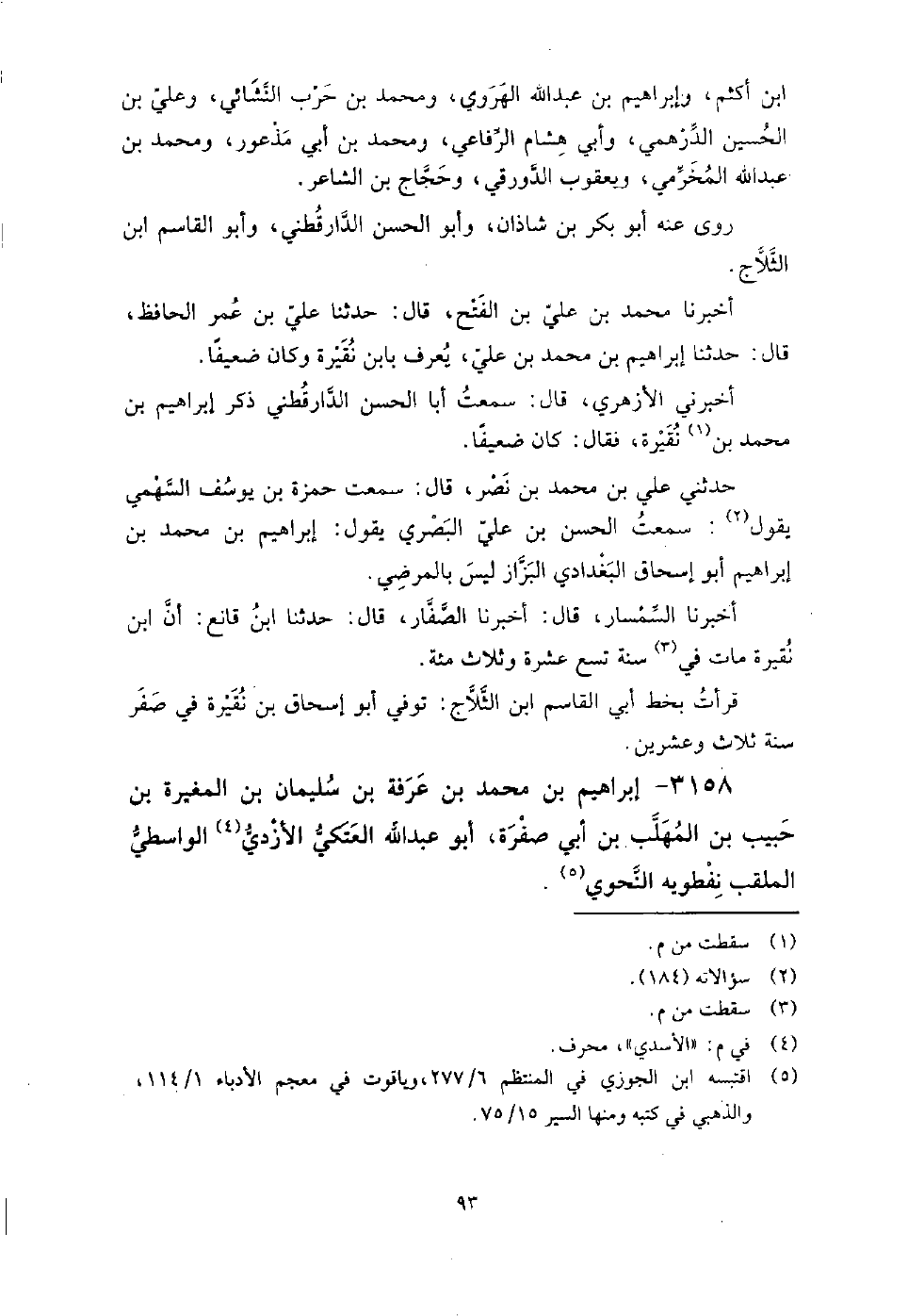 3158 - إبراهيم بن محمد بن عرفة بن سليمان بن المغيرة بن حبيب بن المهلب بن أبي صفرة أبو عبد الله العتكي الأزدي الواسطي الملقب نفطويه النحوي سكن بغداد، وحدث بها عن: إسحاق بن وهب العلاف، وخلف بن محمد كردوس، ومحمد بن عبد الملك الدقيقي الواسطيين، وشعيب بن أيوب الصريفيني، وعباس بن محمد الدروي، وعبد الله بن محمد بن شاكر، وأحمد بن عبد الجبار العطاردي، وعبد الكريم بن الهيثم العاقولي، وغيرهم، روى عنه: أبو بكر محمد بن عبد الله الشافعي، وأبو طاهر بن أبي هاشم المقرئ، وأبو عمر بن حيويه، وأحمد بن إبراهيم بن شاذان، وأبو عبيد الله المرزباني، والمعافى بن زكريا، وكان صدوقا، وله مصنفات كثيرة، منها كتاب كبير في غريب القرآن، وكتاب التاريخ، وغيرهما.