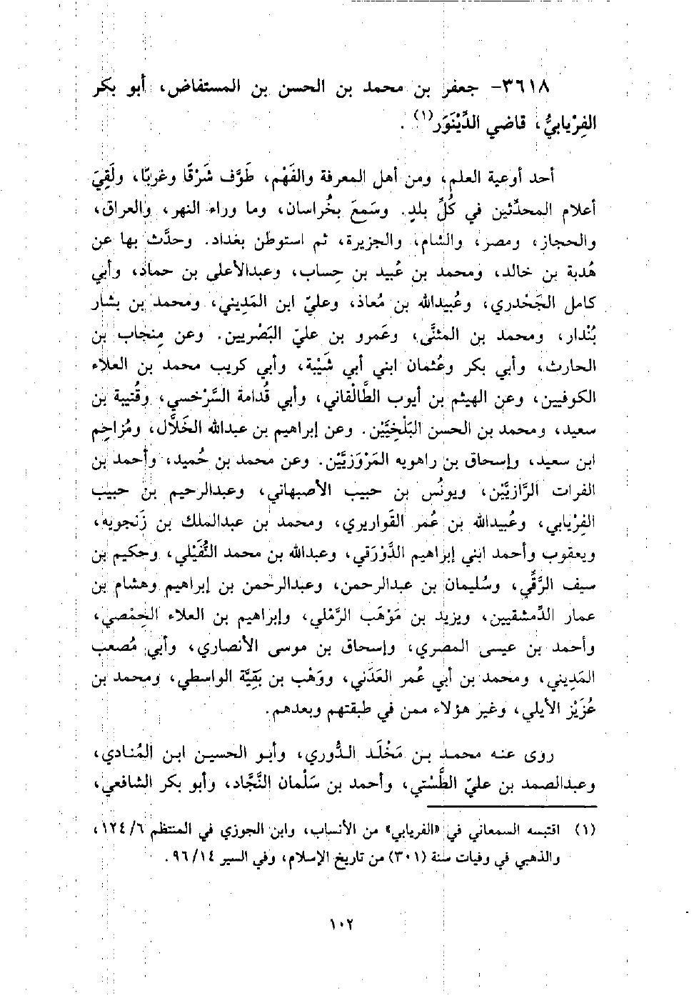 3618 - جَعْفَر بن مُحَمَّدِ بْنِ الْحَسَن بن المستفاض، أَبُو بَكْرٍ الفريابي قاضي الدينور أحد أوعية العلم، ومن أهل المعرفة والفهم، طوف شرقا وغربا، ولقي أعلام المحدثين فِي كل بلد، وسمع بخراسان، وما وراء النهر، والعراق، والحجاز، ومصر، والشام، والجزيرة، ثم استوطن بغداد.